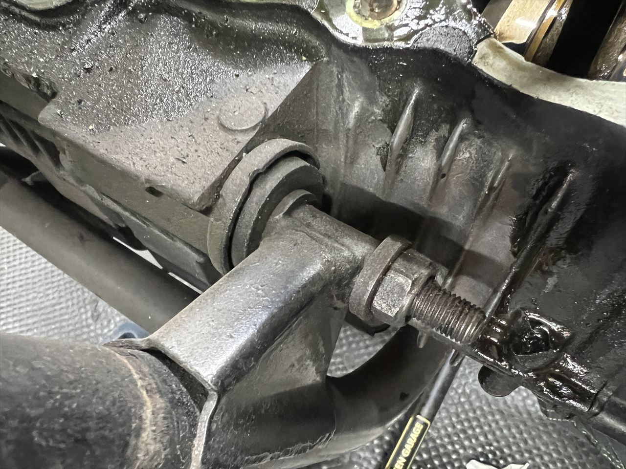 エンジンマウント左上部です。U字の厚ワッシャーがありません。組み忘れでしょう。エンジン腰下も分解歴があるかもしれません。