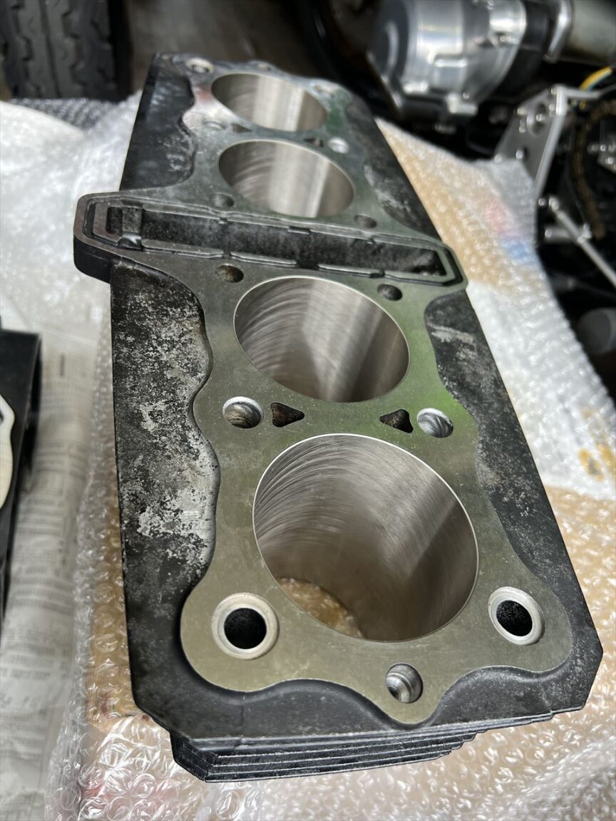 そのシリンダーはこちら。スリーブがあまりにピッタリなので、境目がほとんどわかりません。面研も標準で行われ、メッキシリンダーはプラトーホーニングまでが標準仕様。鋳鉄スリーブよりはるかに長持ちします。