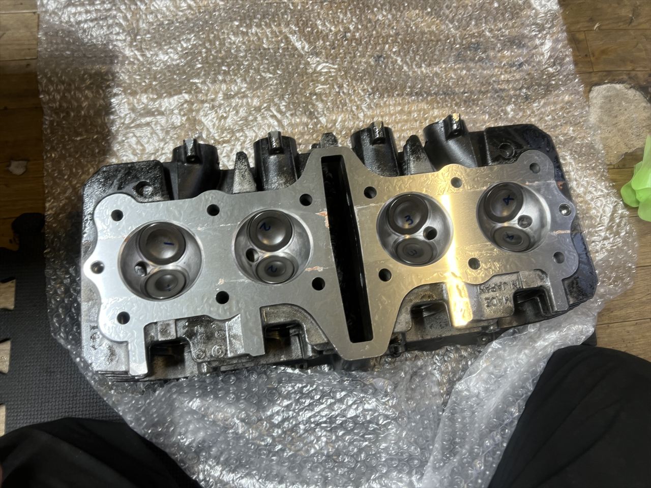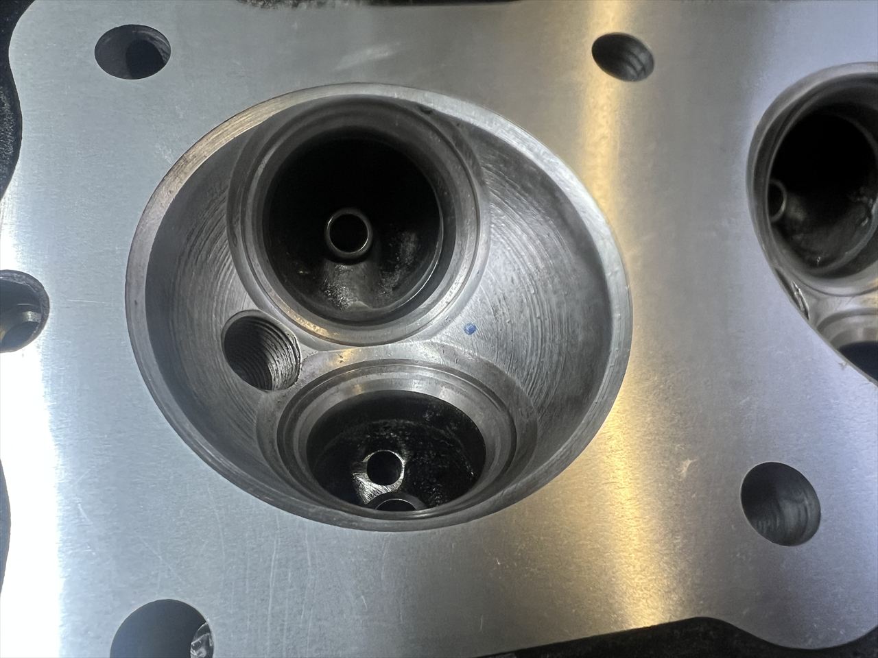ヘッドも加工しました。バルブシートの摩耗が多かったので、バルブは純正新品に交換し、それに合わせてシートカット、面研も実施しました。