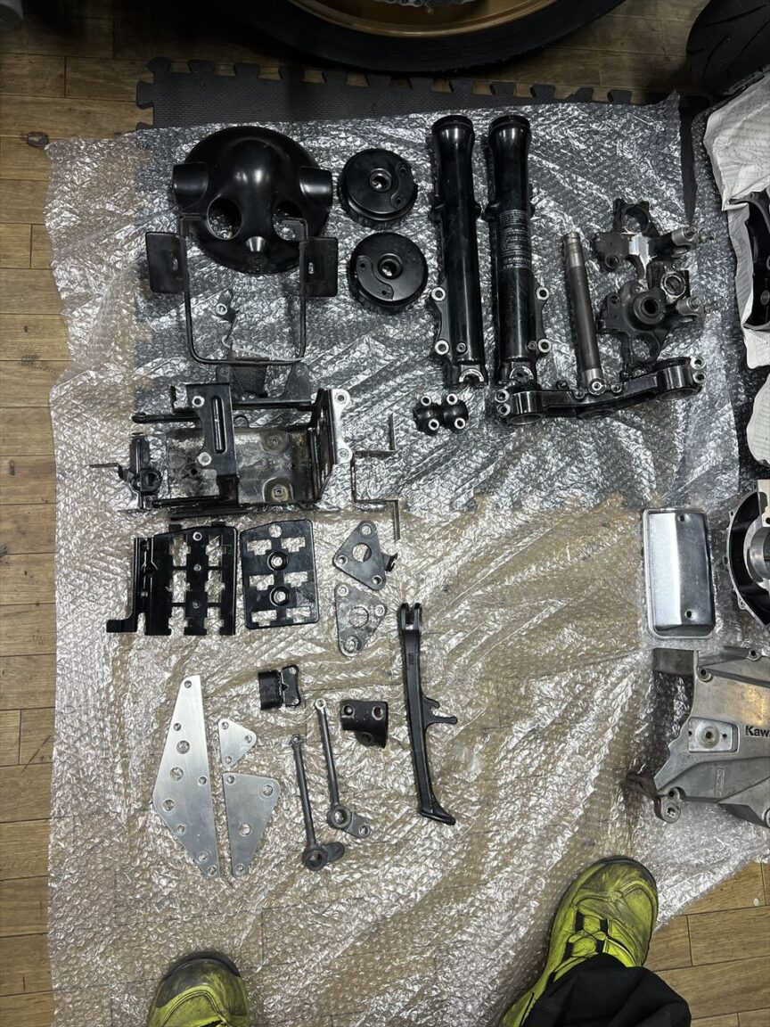 これで塗装関係の部品が全て揃いました。先行しているフレーム塗装に追っかけで塗装工程へ進みます。