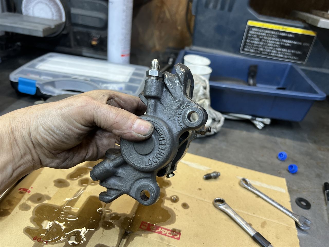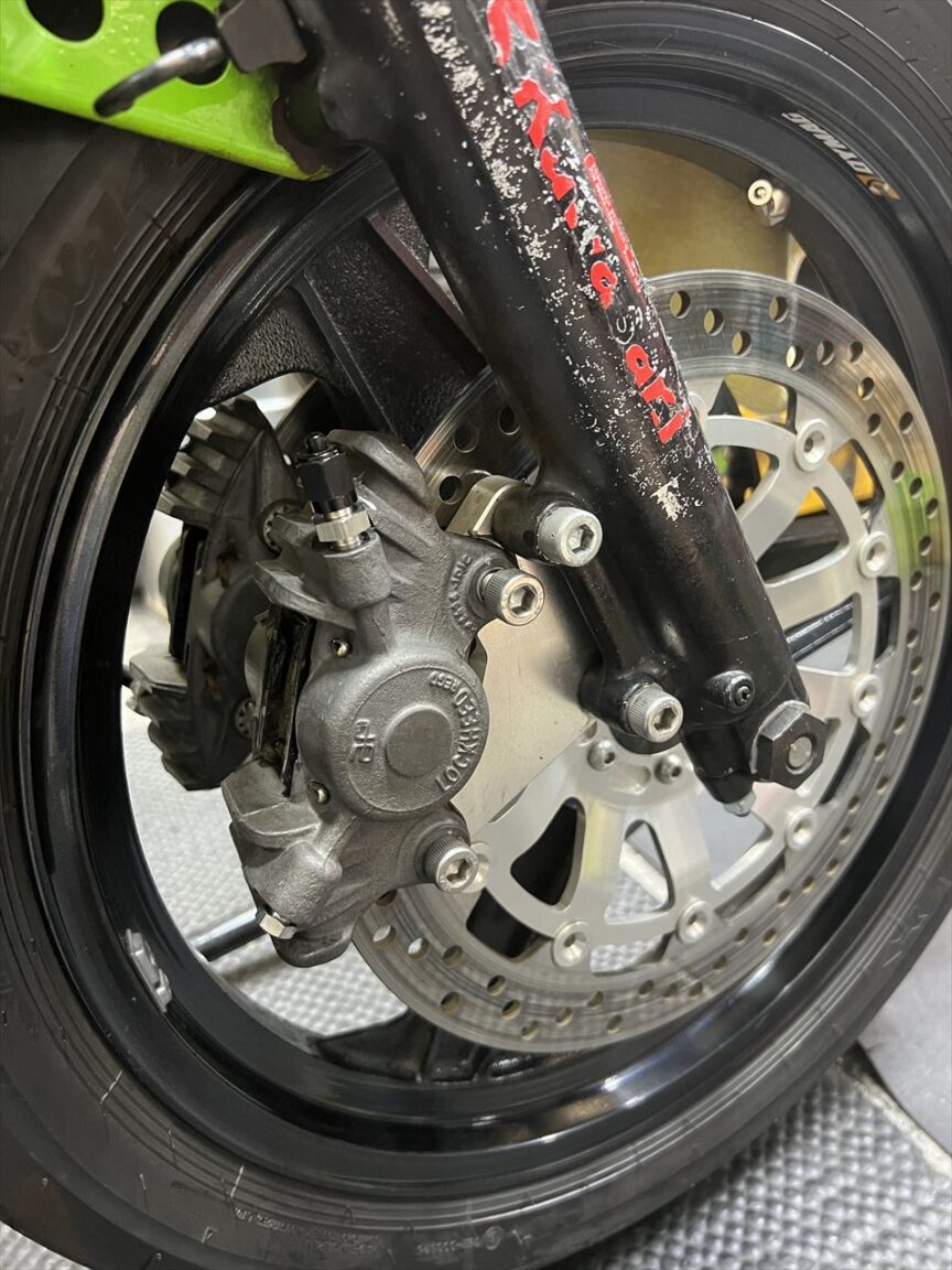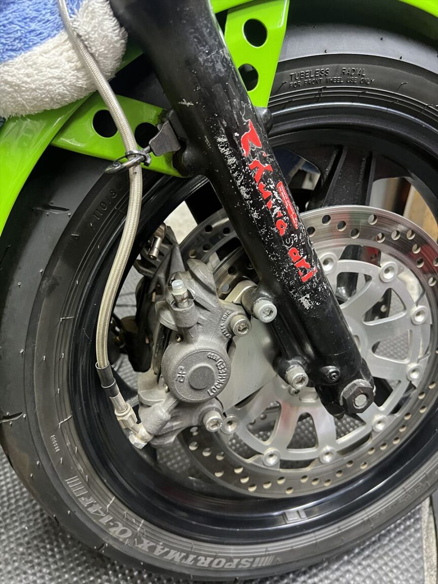 続いてフロントブレーキ周りです。アップハンドルだったため長いホースが付いており、コンチハンへの変更に合わせてホースは新たに製作することに。キャリパーもブリーダーの位置などがよろしくないので組み替えます。