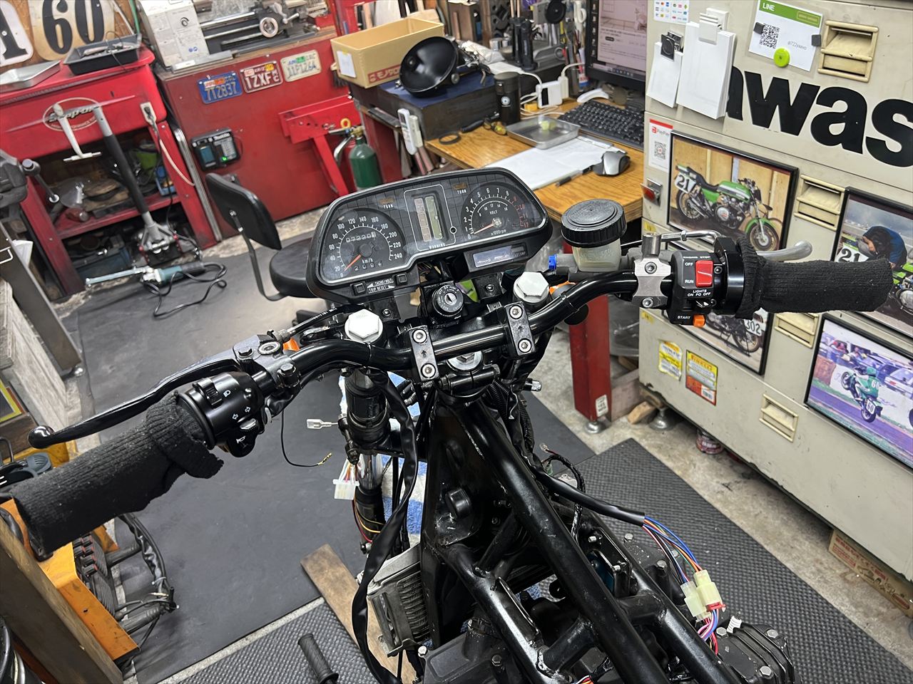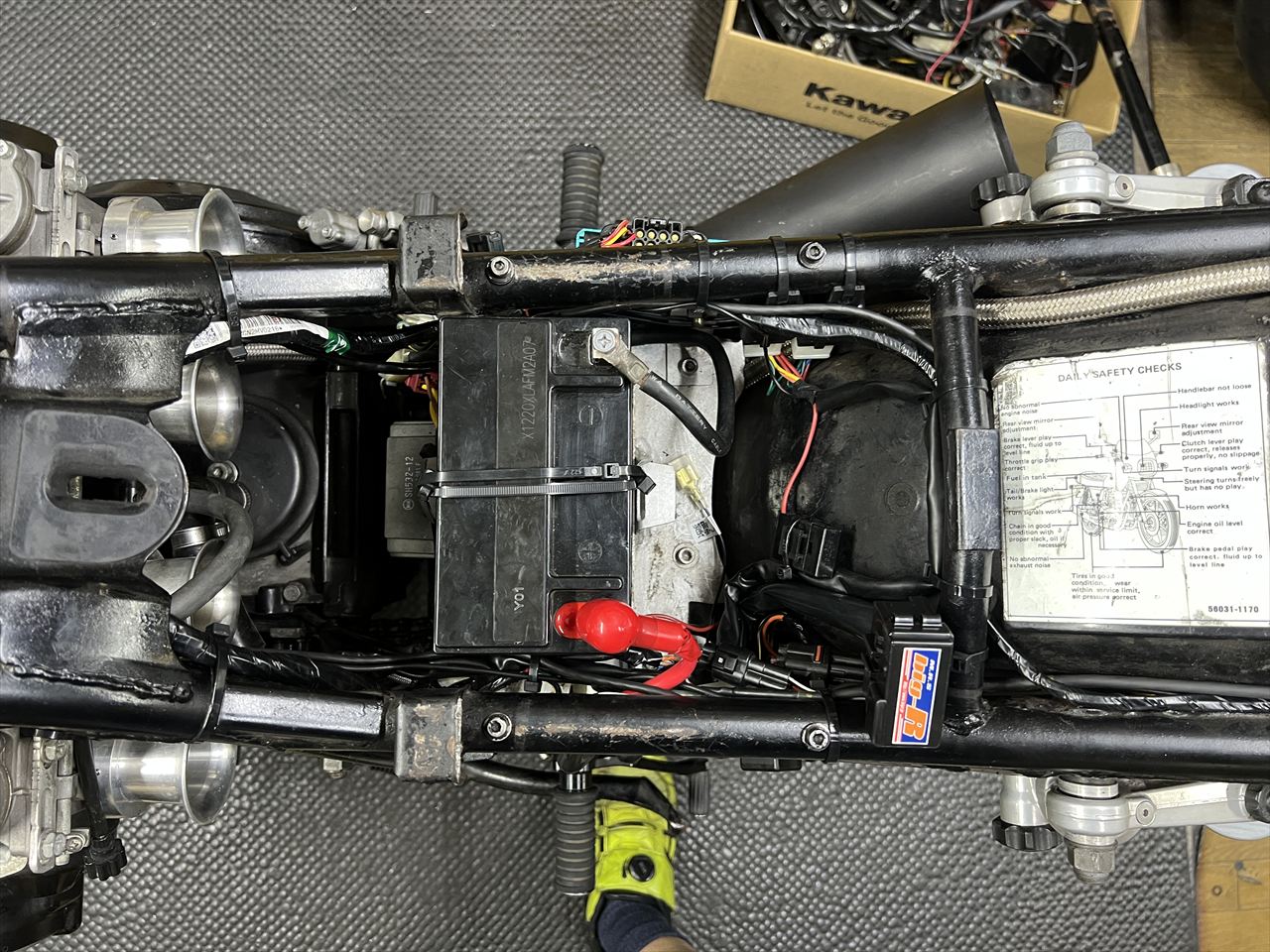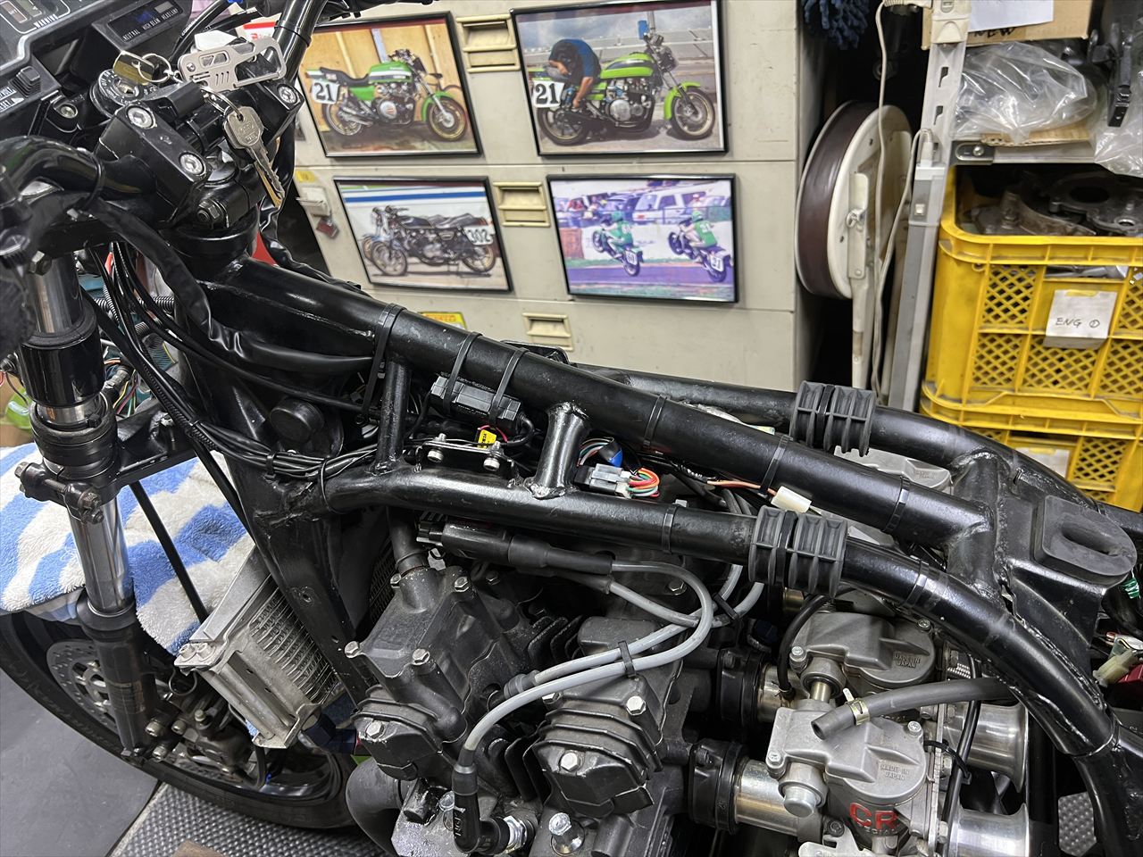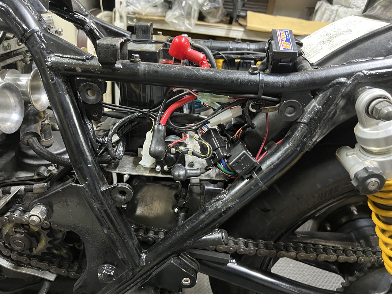各系統のハーネスは、なるべく交差しないよう平行にレイアウトし、回路を目視で追い易くしてあります。今後はZ1000-R2の配線図を元にして、故障探求し易くなったことでしょう。