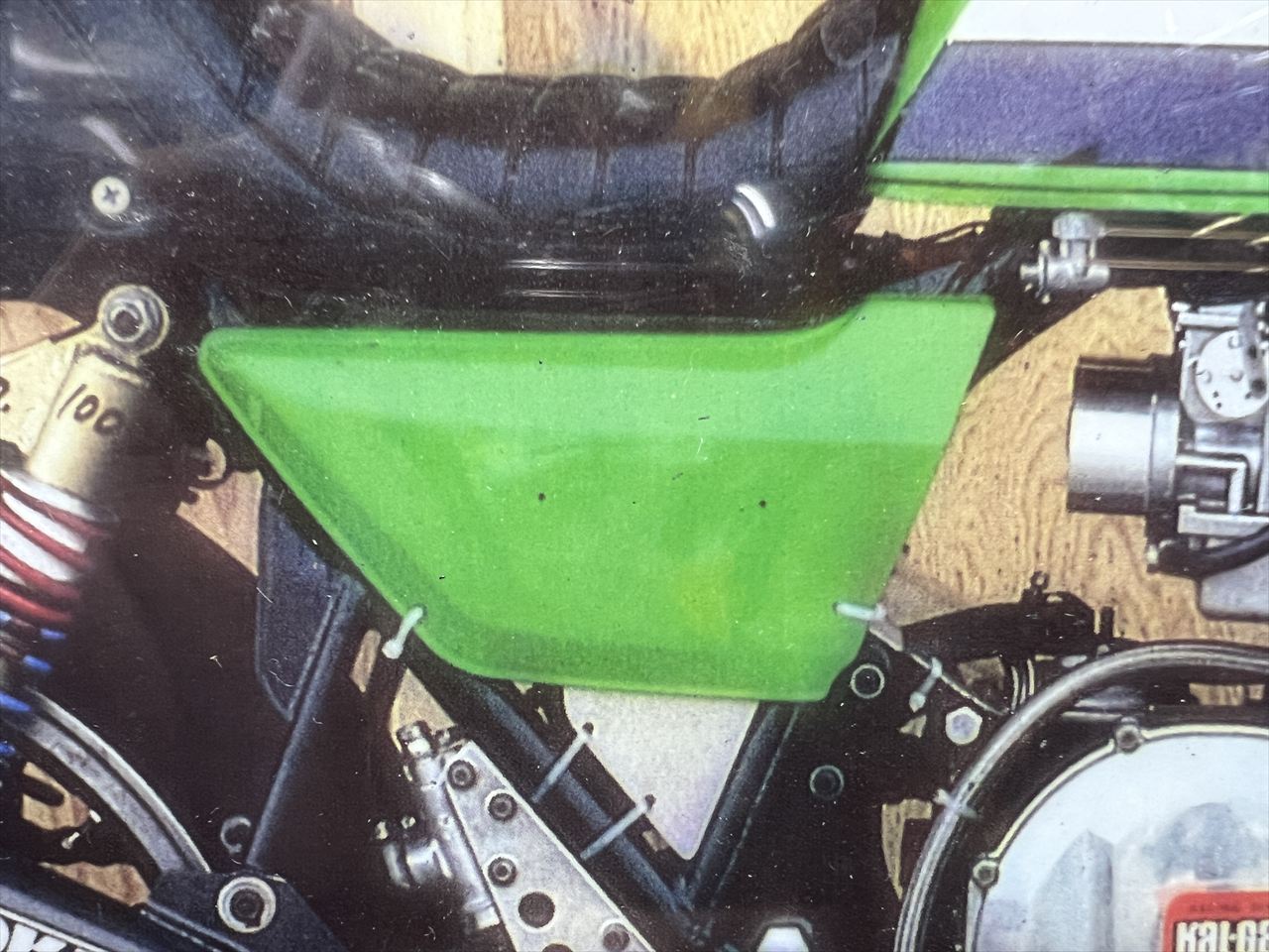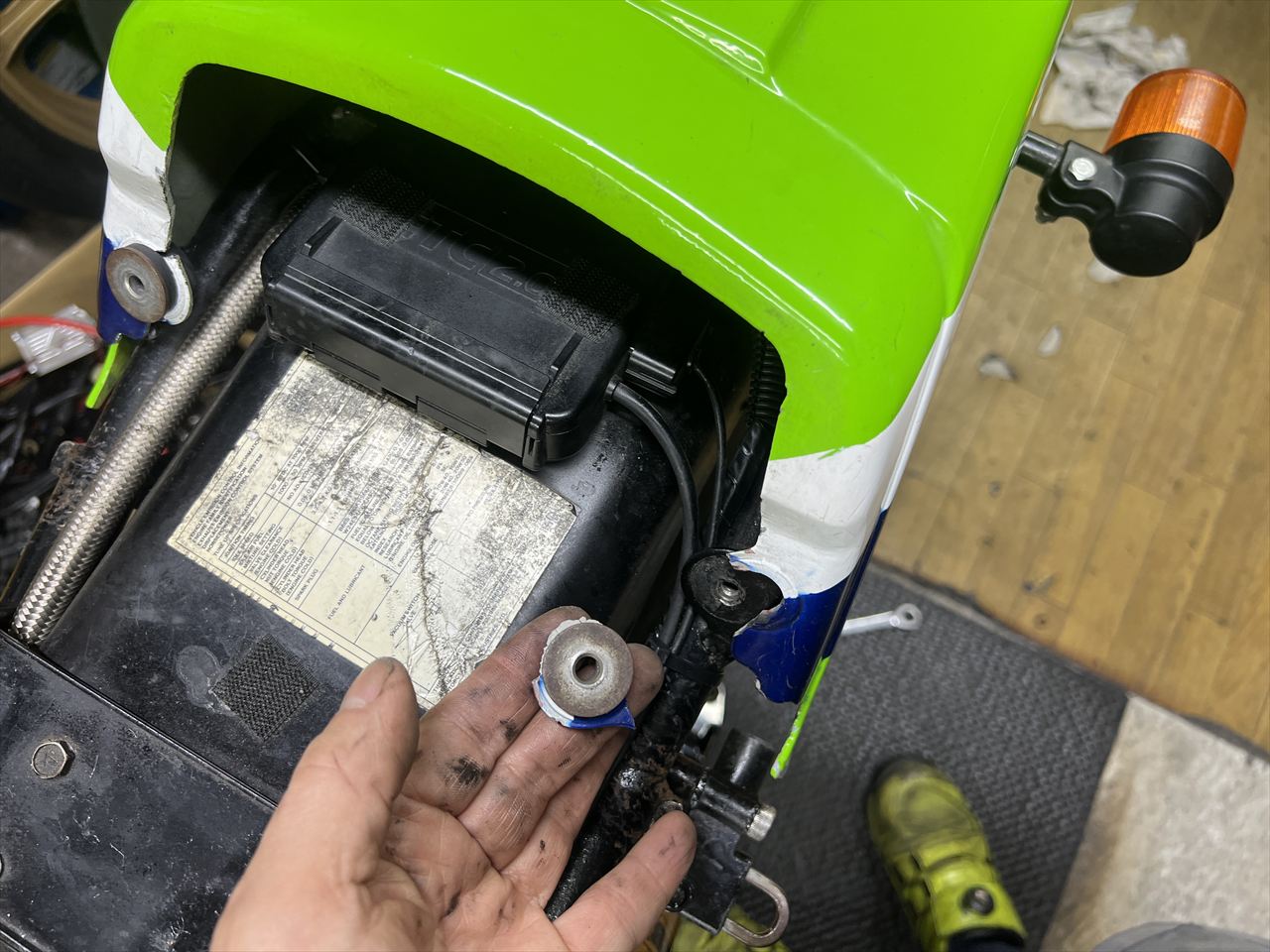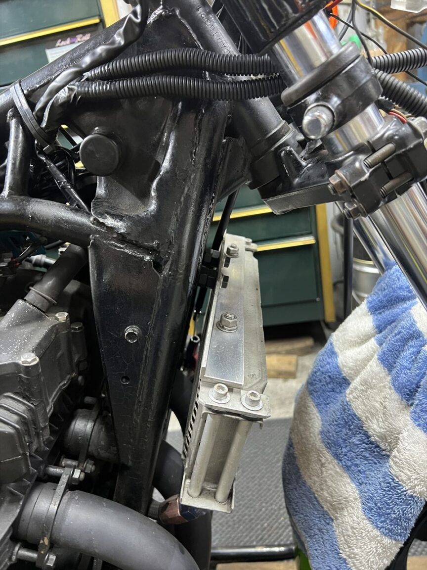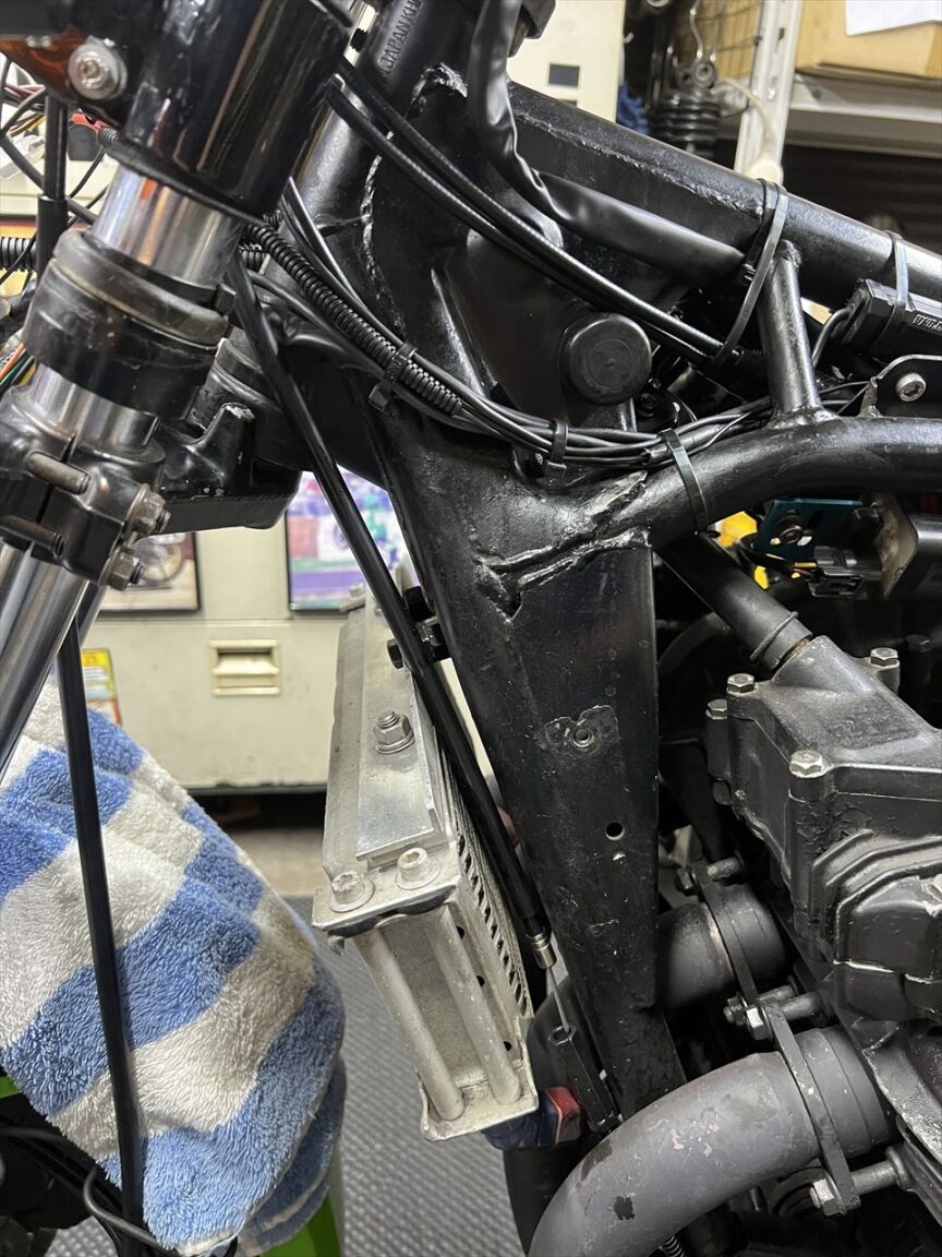 カウル前側の取り付け点はクラックが入りやすいですが、こちらは両方とも割れて分離していました。シートを付けるとカウルは両側から押さえられるので外れることはありませんが、機会があればカウルを交換したいところですね。純正の良品は希少ですが、質のいいFRP製が市場にあるのでそれでもいいと思います。