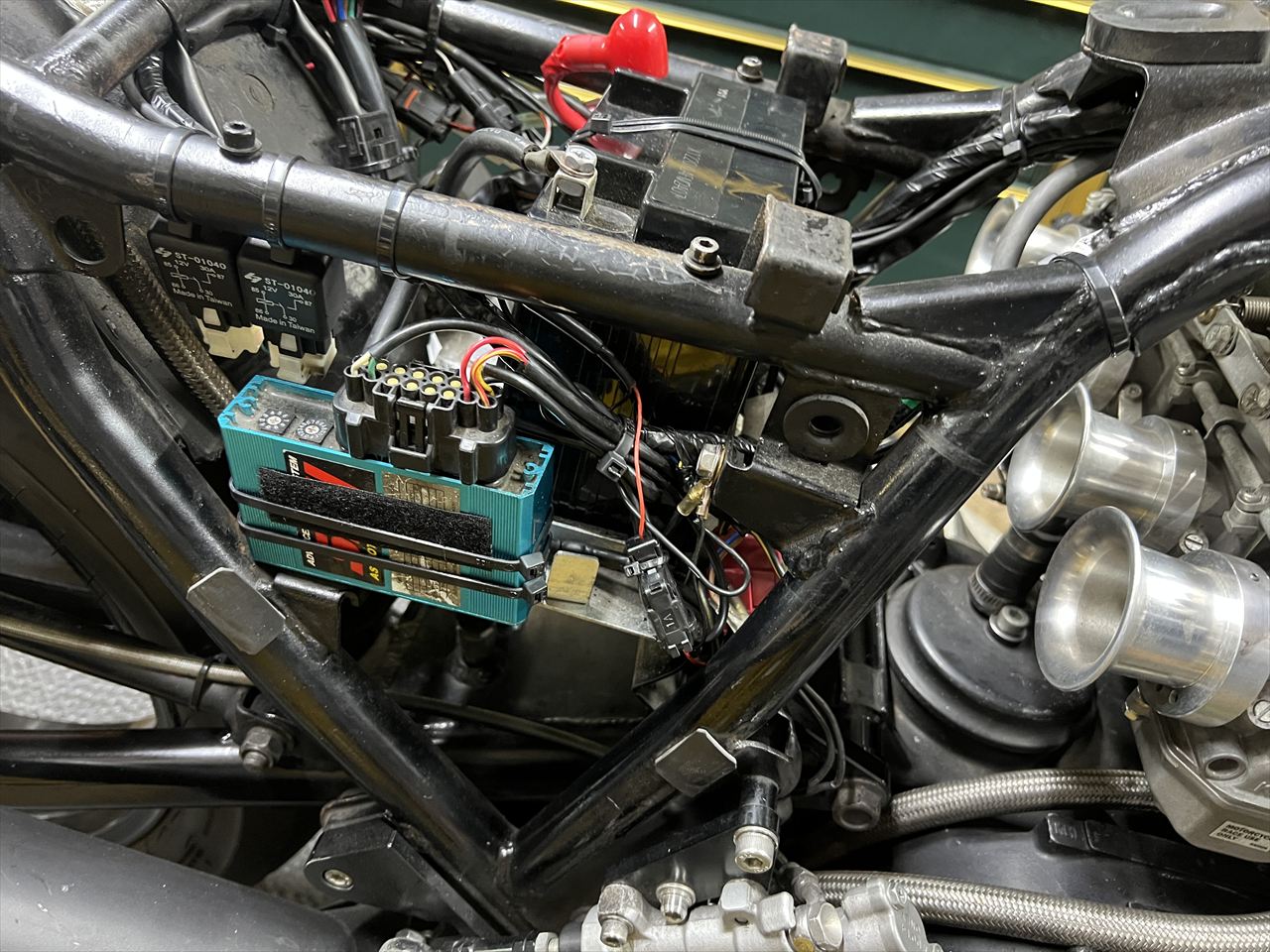 ウインカーリレーはハイレスポンスタイプを使用します。ウインカースイッチを入れた瞬間に先ず点灯するタイプです。スズキ純正部品で部品番号は 38610-06F01、現在の値段は少々お高めの税込み2,970円ですが、使ってみるとストレスフリーなのでマストアイテムとなりますね。