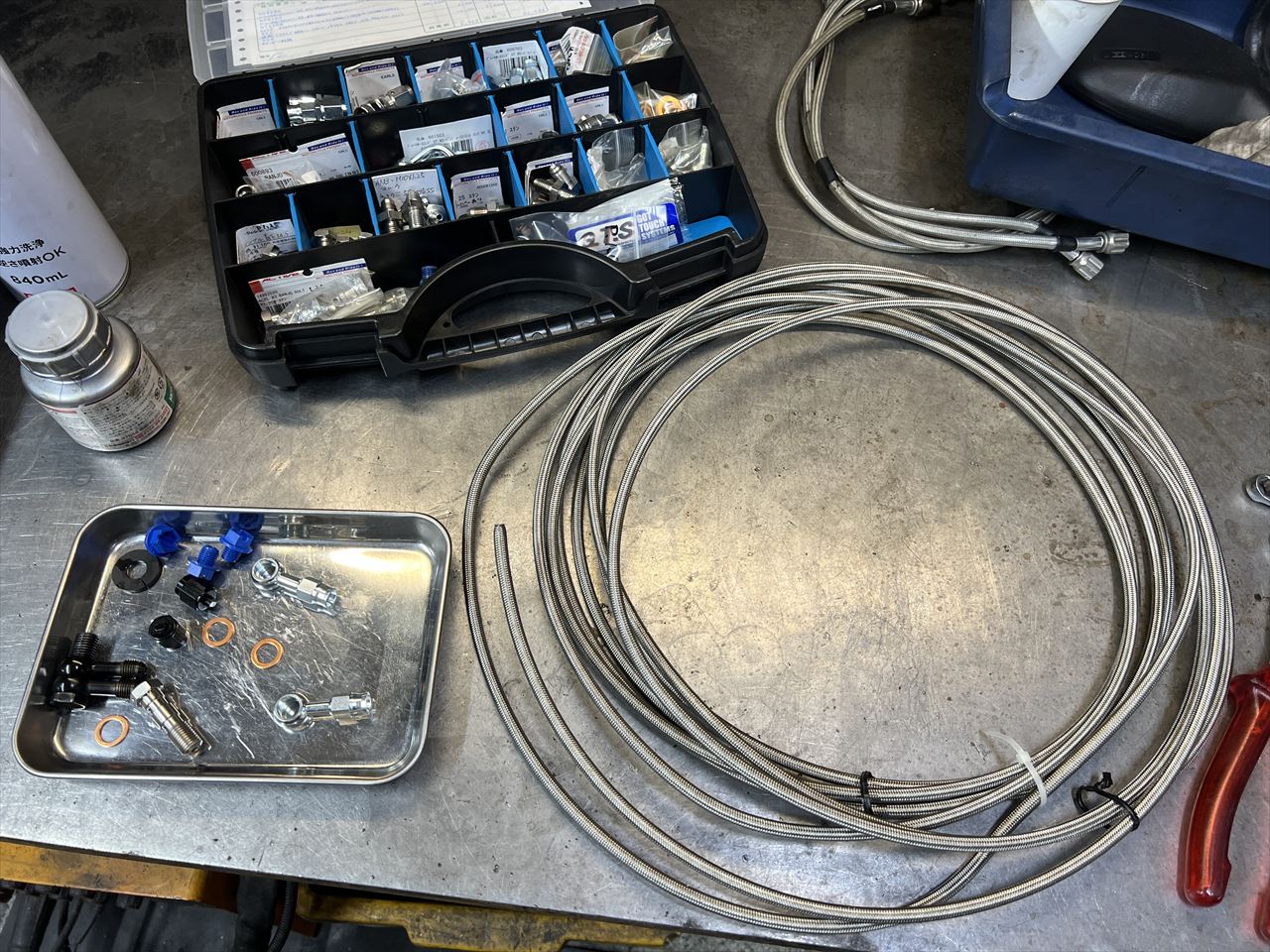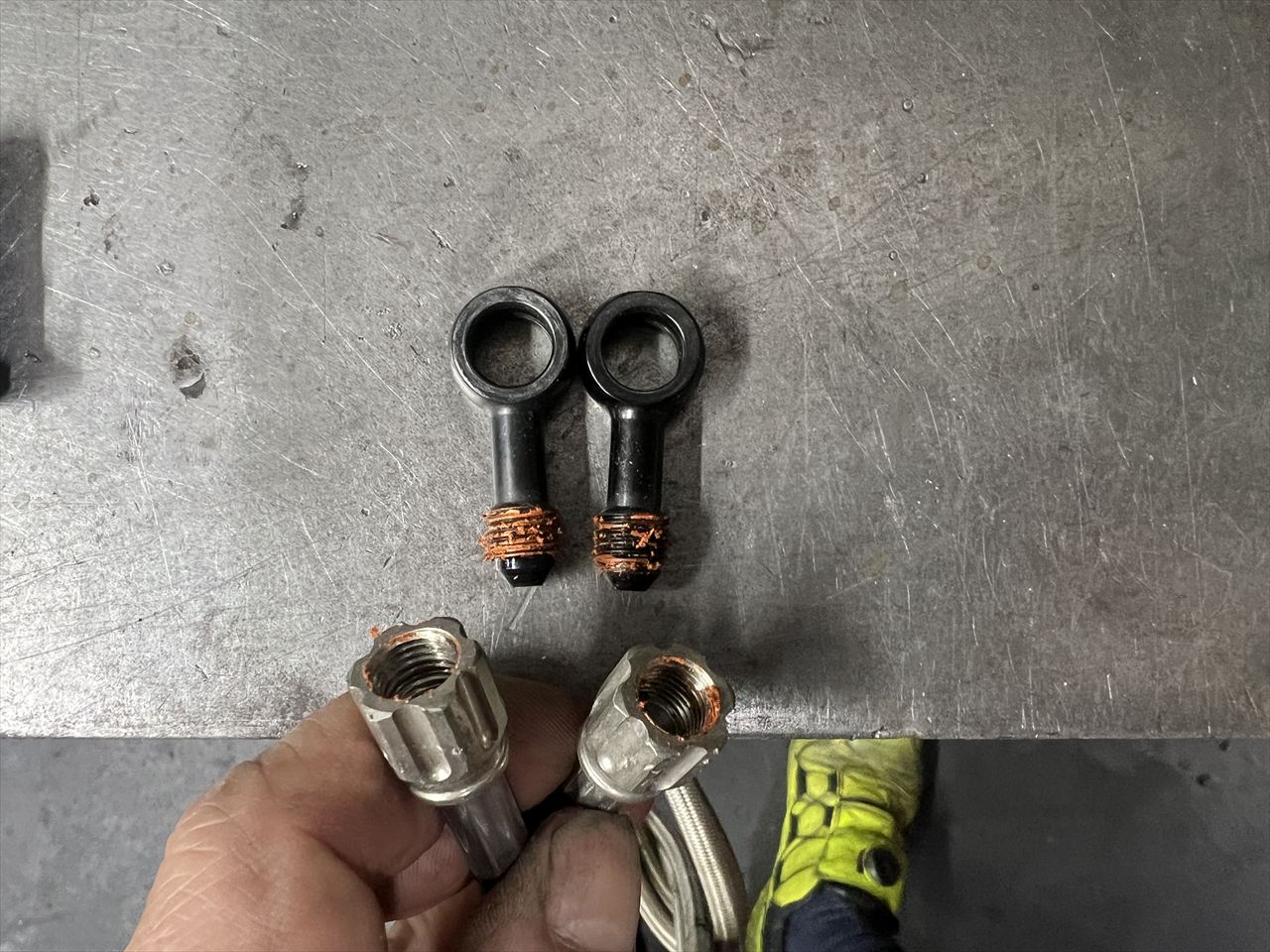 既存のホースはもう使いませんが、マスター側バンジョーのANネジ部にオレンジ色のものが付いていたので分解してみます。おそらくベンガラ色の液体ガスケットでしょうか。内部までたっぷり塗られていました。他にも不適切な組付けがあるかもしれません。