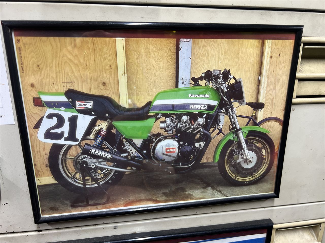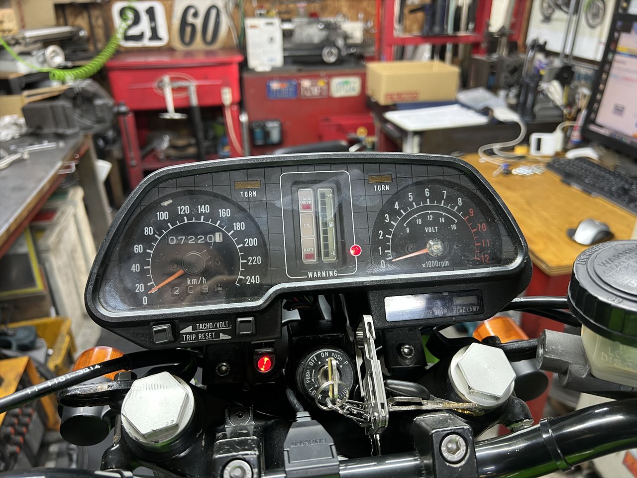 続いてメーター内のインジケーター付きっぱなし問題の対策です。この車両はZ1100-B2なので、角メーター内に液晶のインジケーターが付いています。右のバー表示は燃料計、左の赤いマークは上から サイドスタンド戻し忘れ警告 オイルレベル警告 バッテリー液面警告 です。この場合はサイドスタンドとバッテリー警告が点滅し、ワーニング白枠上にある赤いLEDも眩しく点滅します。Z1000-R2メインハーネスに交換したことでこのワーニング機構が機能せずに点いてしまいます。これでは煩わしいので修正します。
