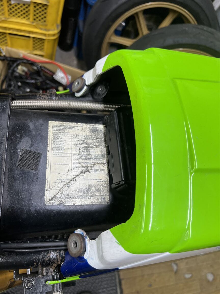 サイドカバーもいくつか爪が折れてなくなっており、左側はバッテリーケースが純正でないので止め点が1個ありません。もともとタイラップ併用で付けられていましたが、カスタム車の場合止め方はワークスレーサーを真似るといいともいます。