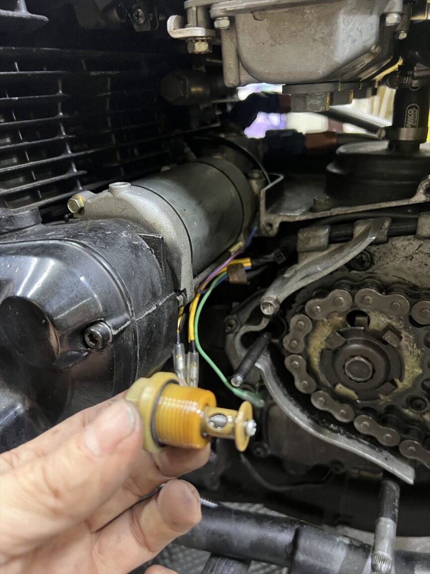 オイルレベル警告灯はインジェクション車であるB2やGPZ1100のみにある装備で、代わりにオイルプレッシャースイッチは付いていないのが純正です。この車両は社外のオイルクーラー取出しにオイルプレッシャースイッチが付いていたのでそこに配線しましたが、回路図をよく確認すると動作の極性が逆なので、これに繋ぐと逆の動作になってしまいますね。