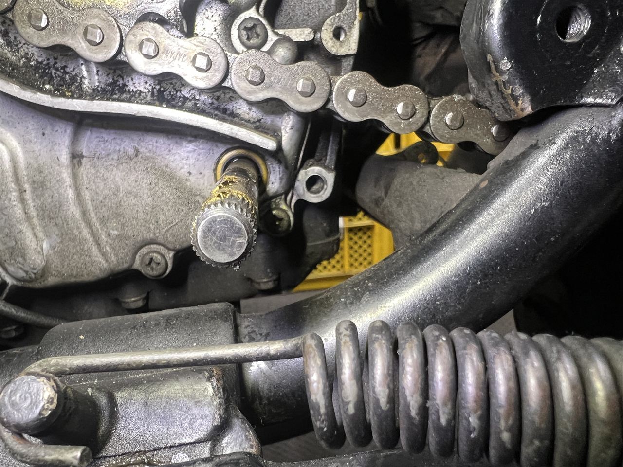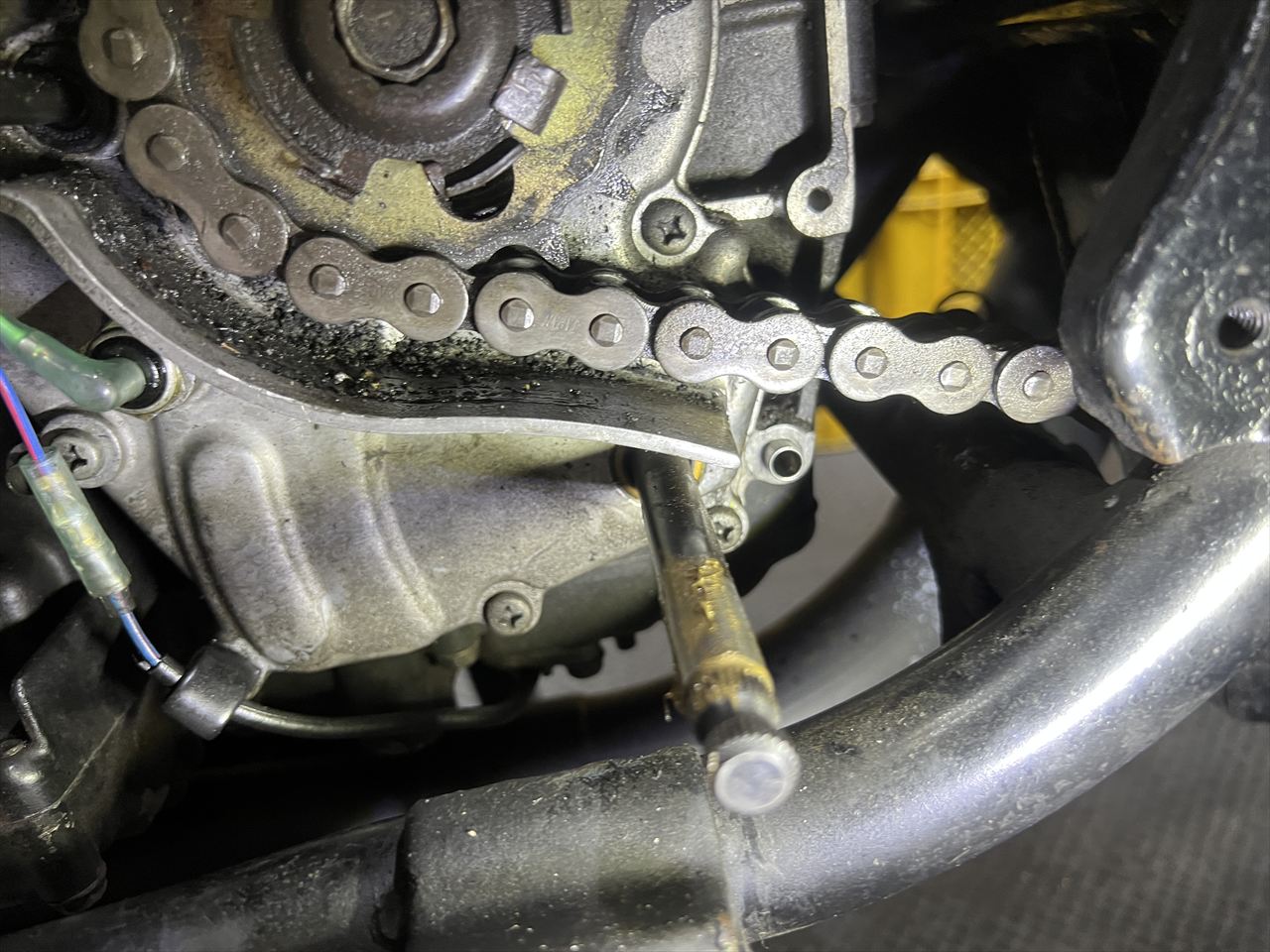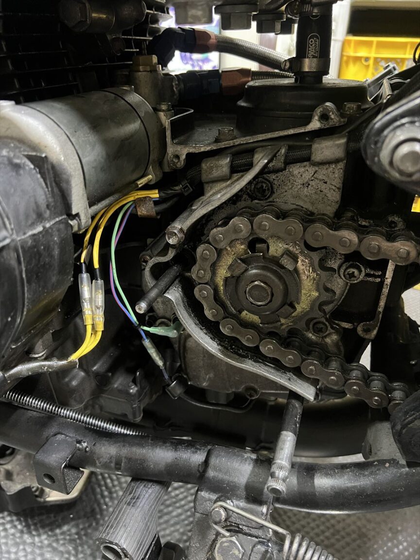 スプロケカバーを開けた時にいつも確認するのがダウエルピンの存在です。4本止めの下側2ヵ所に入れてあり、カバーの位置出しとシフト操作による前後移動のズレ防止の役目があります。この車両はリヤ側のピンが欠品していたので入れておきます。