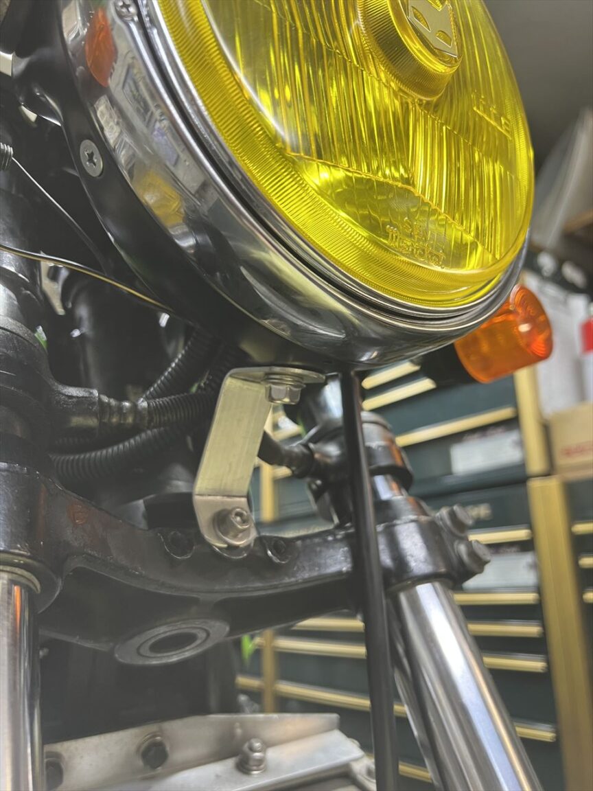 ヘッドライトは上下光軸調整のステーが無くグラグラしていたので、良さそうな位置でステーで止めておきます。若干の上下調整は、このステーを曲げるなどして合わせて下さい。