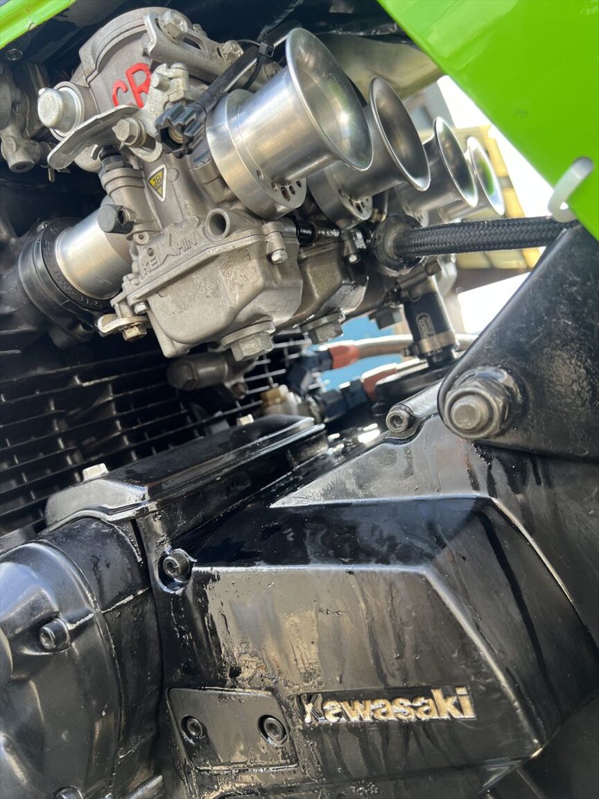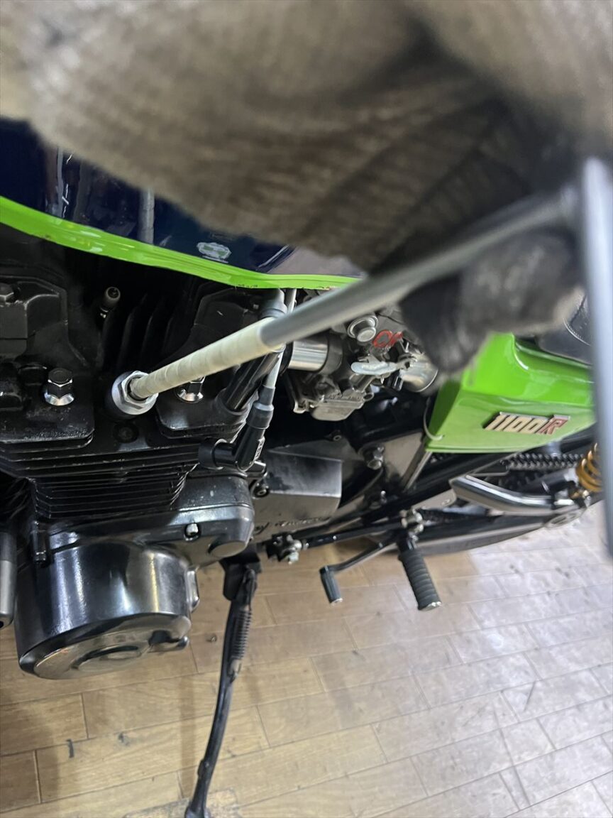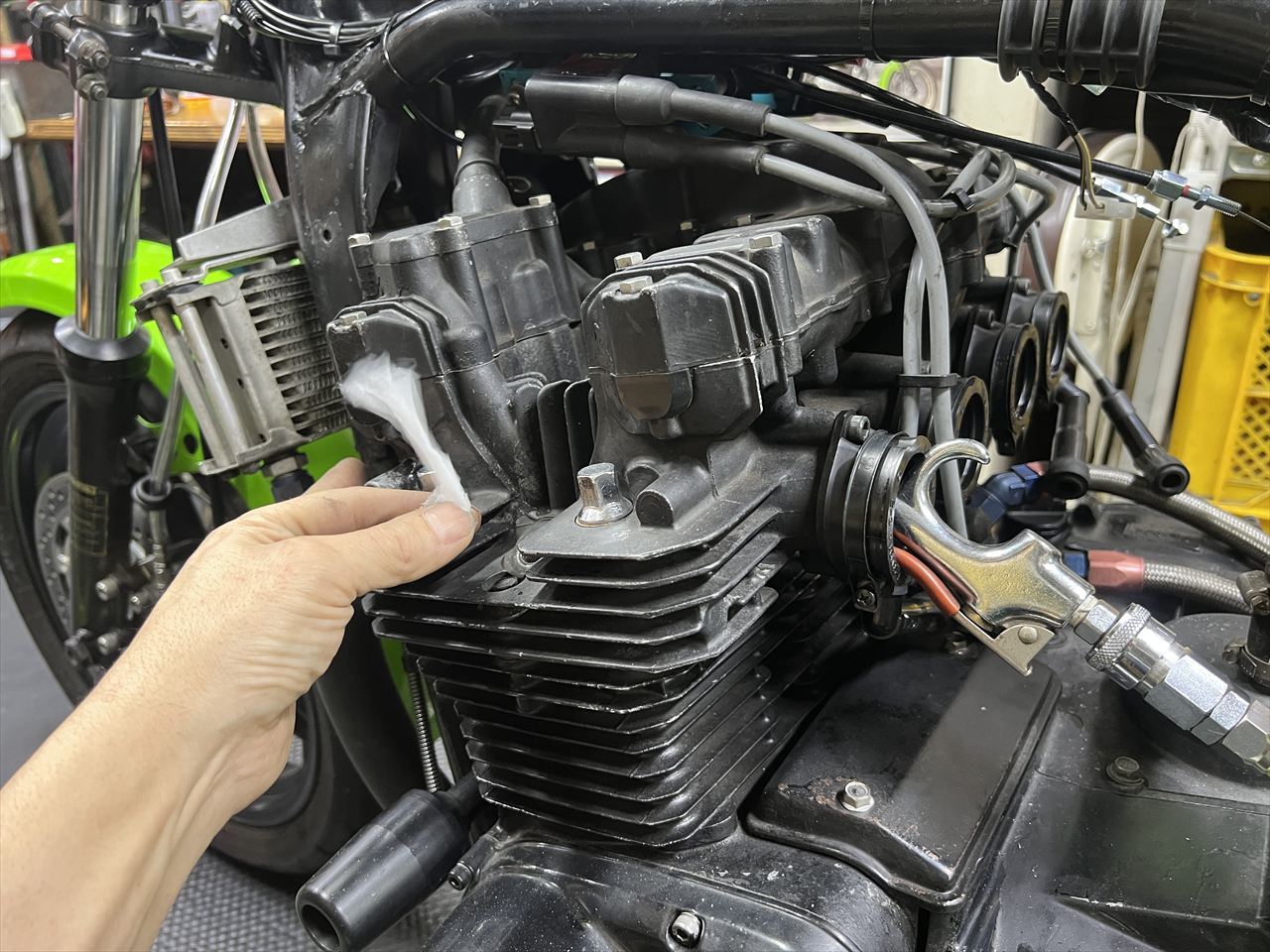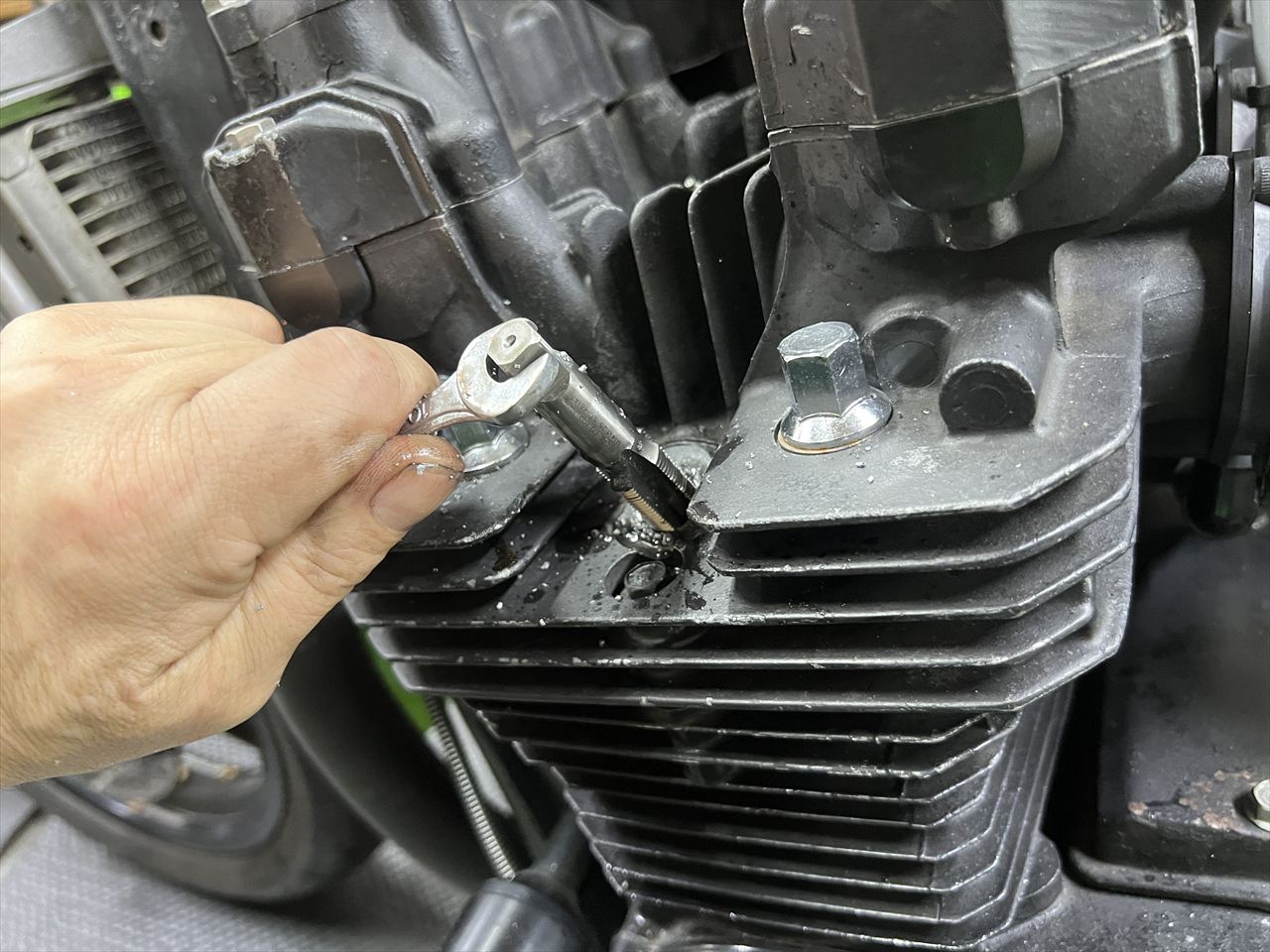 今回、限られた作業期間しかなかったので、プラグネジの修理は車載のまま試してみることにします。キャブを外し、インテークバルブを少し開いた状態にします。タップの切粉がシリンダー内入らないよう、インテークポートからエアガンで吹きながら作業します。