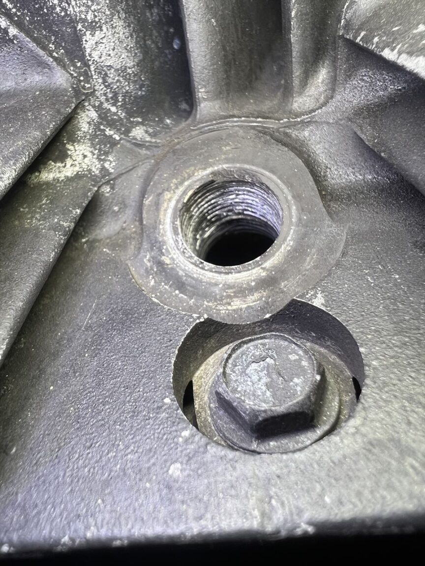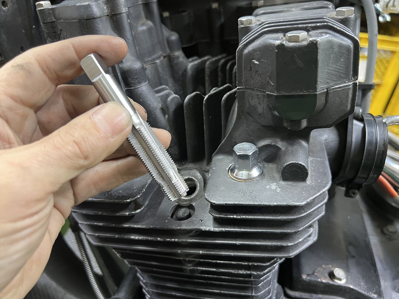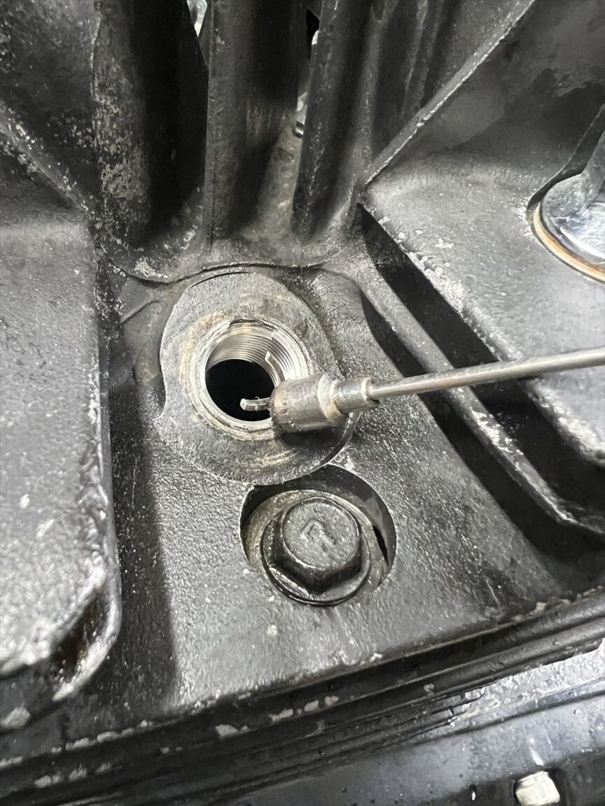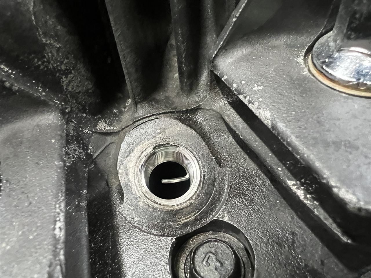 ヘッド側の雌ネジを見ると、ネジ山がかなり低くなっています。もともとトルクがかからないので、ガスケットが潰れないくらい軽く締めていたようです。