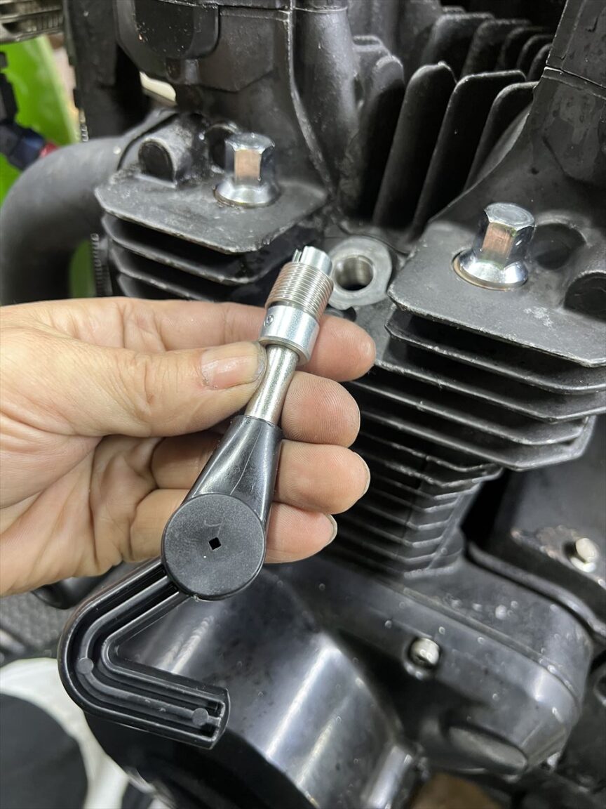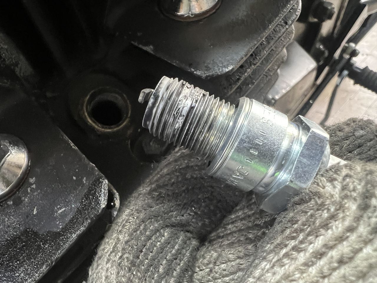 プラグを外そうとするとネジが少しかじる感じで抵抗があります。そのままそーっと回すとなんとか外せました。プラグのネジにはヘッド側のネジ山が付いていますね。よく見るとプラグのガスケットも潰れていません。