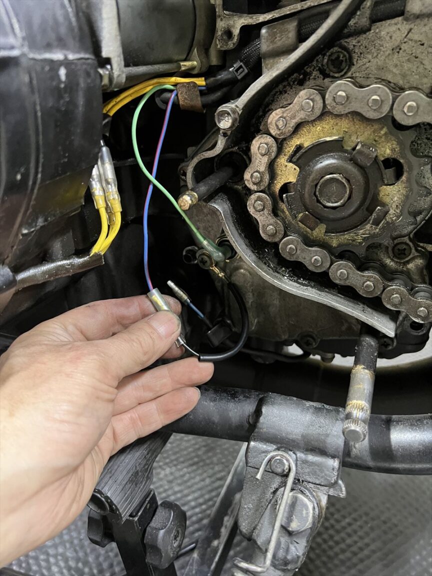 警告灯の線をエンジンに短絡すると警告灯は消えます。どうやらオイルレベルセンサーが故障したようです。センサーの代わりがないので、そのままアース回路を作って繋げ、警告灯を無効化しました。