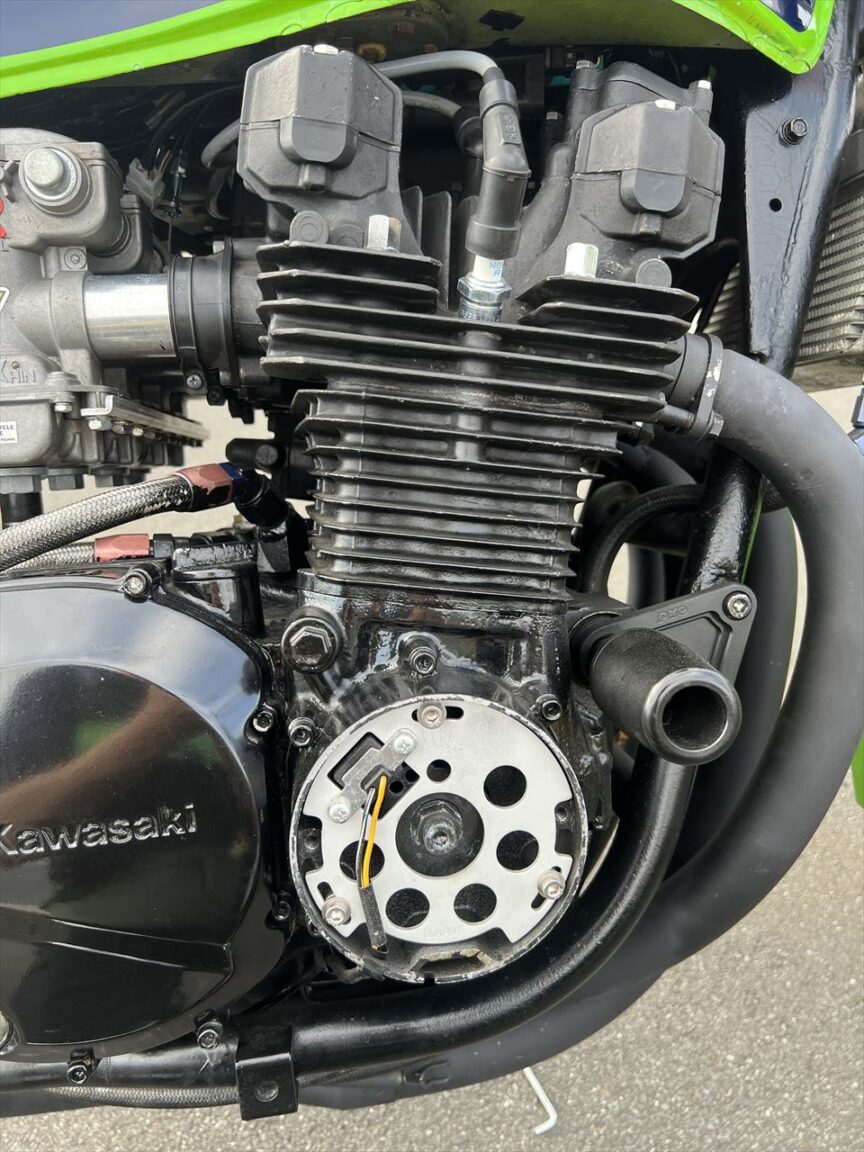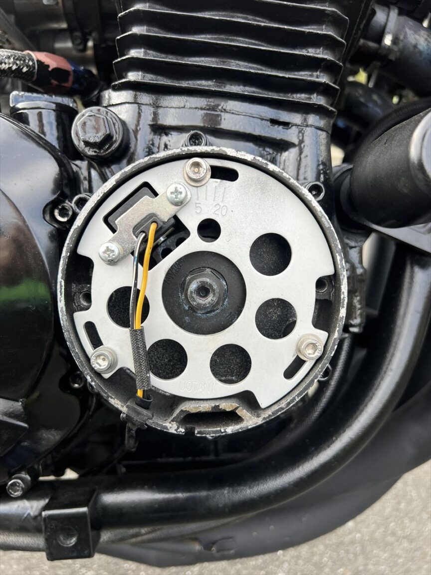 復路でスロットルを開けて高負荷も試してみると、かなりのヘビーノックが発生します。点火系はウオタニSP2なので、ユニットの点火時期ダイヤルで遅角させようとしましたがダイヤルは固着して回せません。仕方なくピックアップコイルのベースプレートを回してイニシャルのBTDC(上死点前)10°から5°戻してBTDC5°にします。