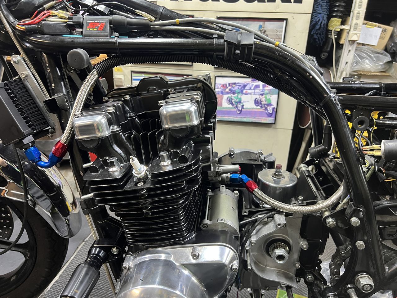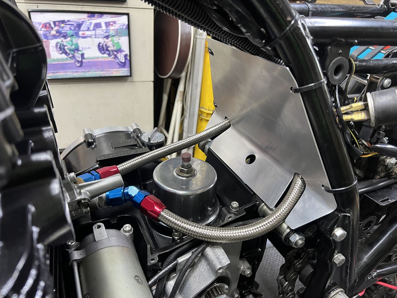 油温センサーのハーネスを艤装します。エンジン回りの配線は、耐熱性の高いシリコン・ガラス編み組みチューブで保護します。