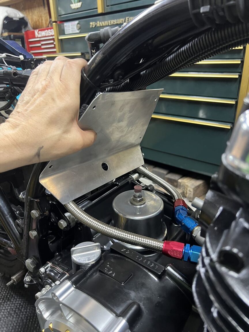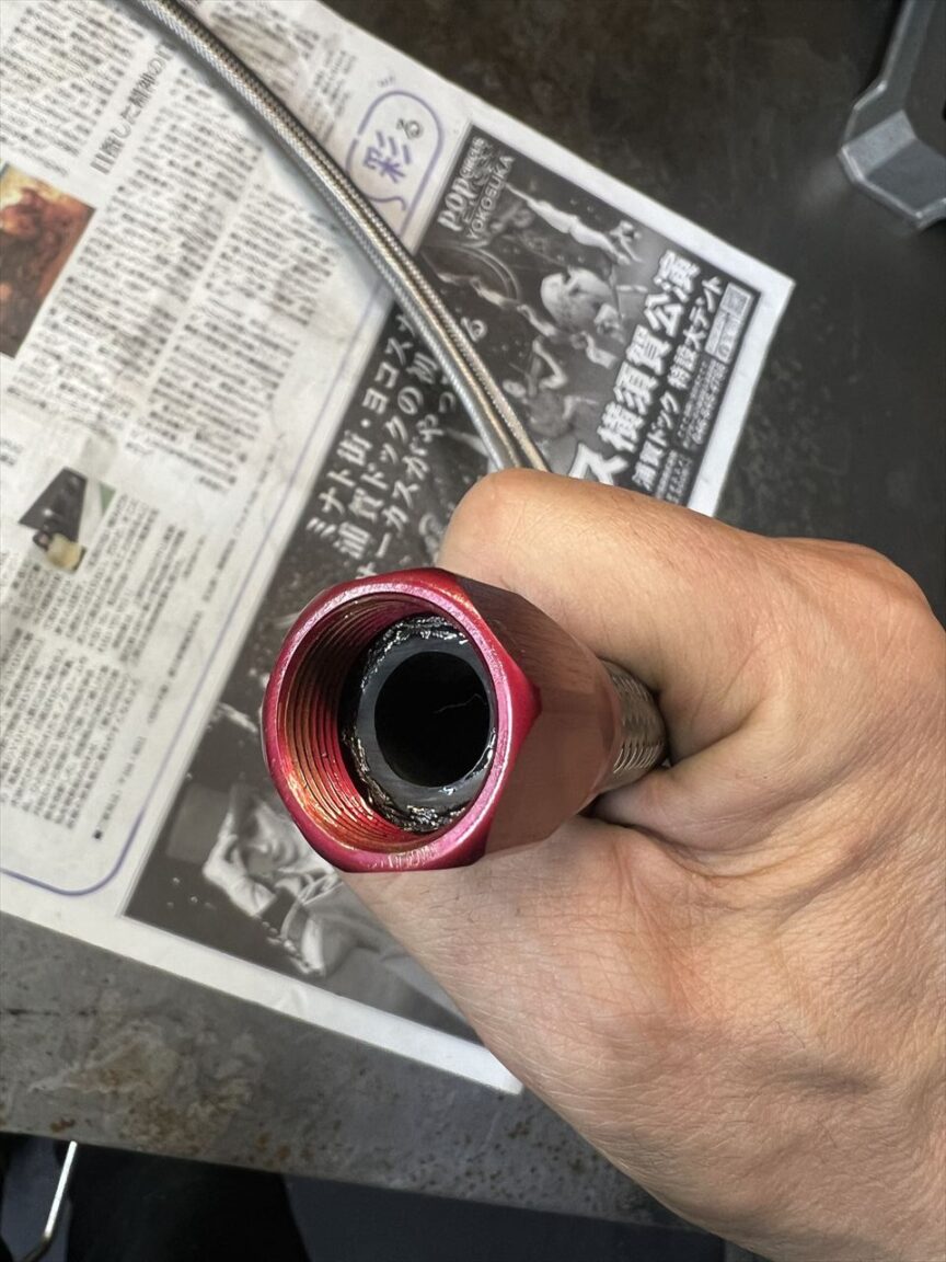 ホースを車体に取り付けます。この際ネジ部はオイルなどで潤滑しますが、シールテープは使用しません。
