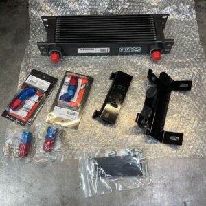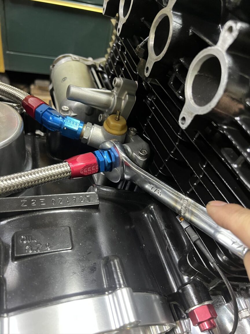 オイルクーラーホースを現車合わせで製作します。先ず、ホースの片側にフィッティングを取り付けます。
