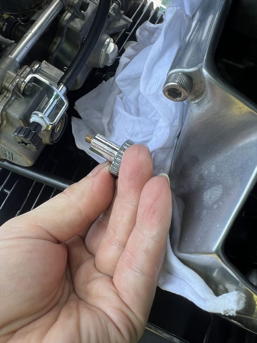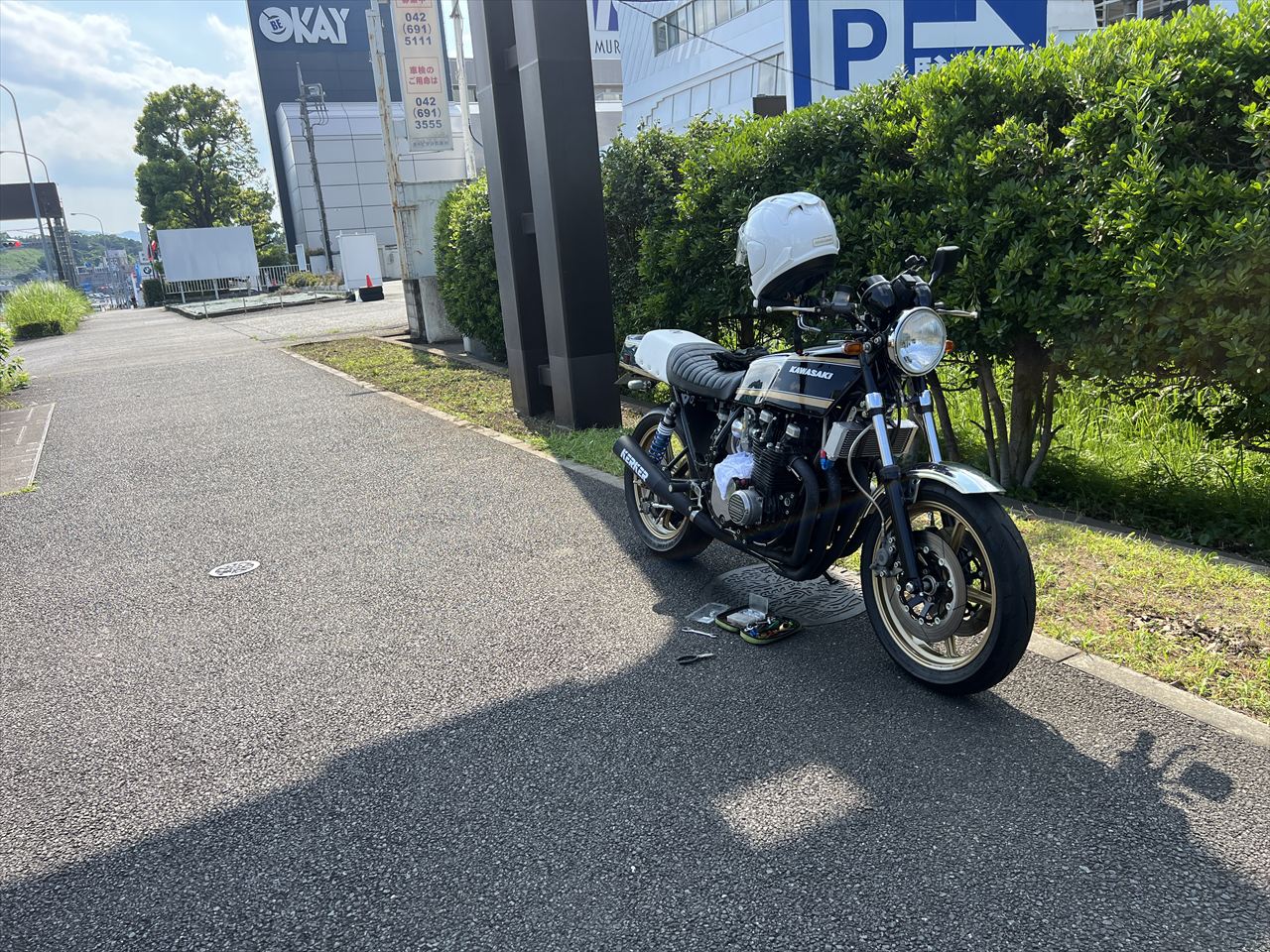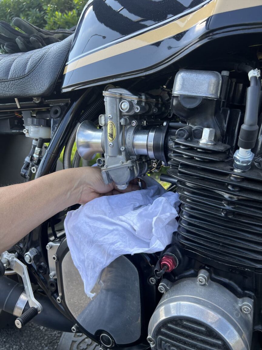 今日は真夏のような天気。アスファルト上の気温は30℃くらいありそうです。エンジン油温も100℃ほど、やけどしそうな状況でのジェット交換です。