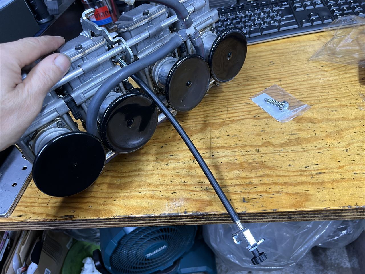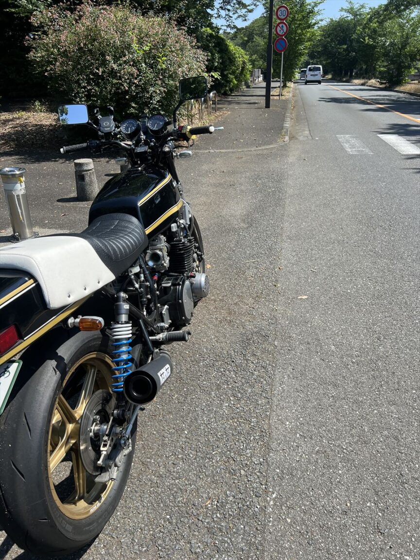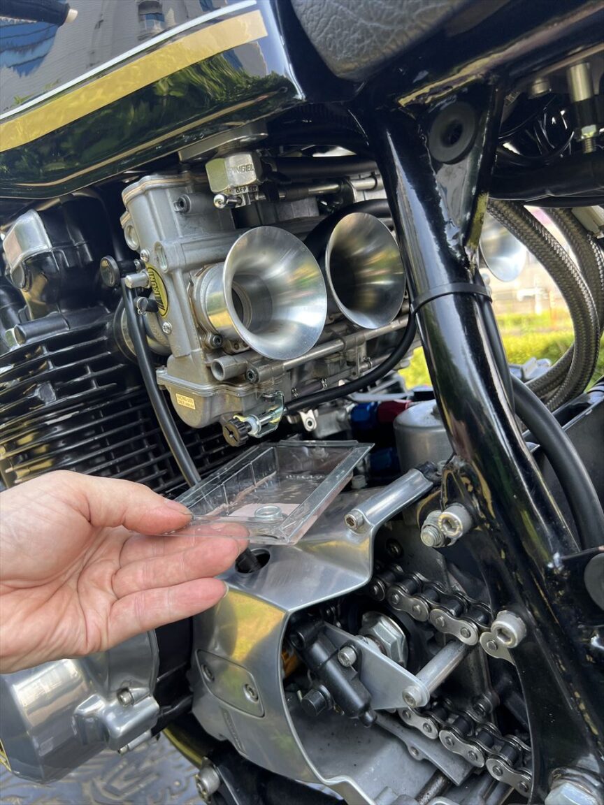 今日は真夏のような天気。アスファルト上の気温は30℃くらいありそうです。エンジン油温も100℃ほど、やけどしそうな状況でのジェット交換です。