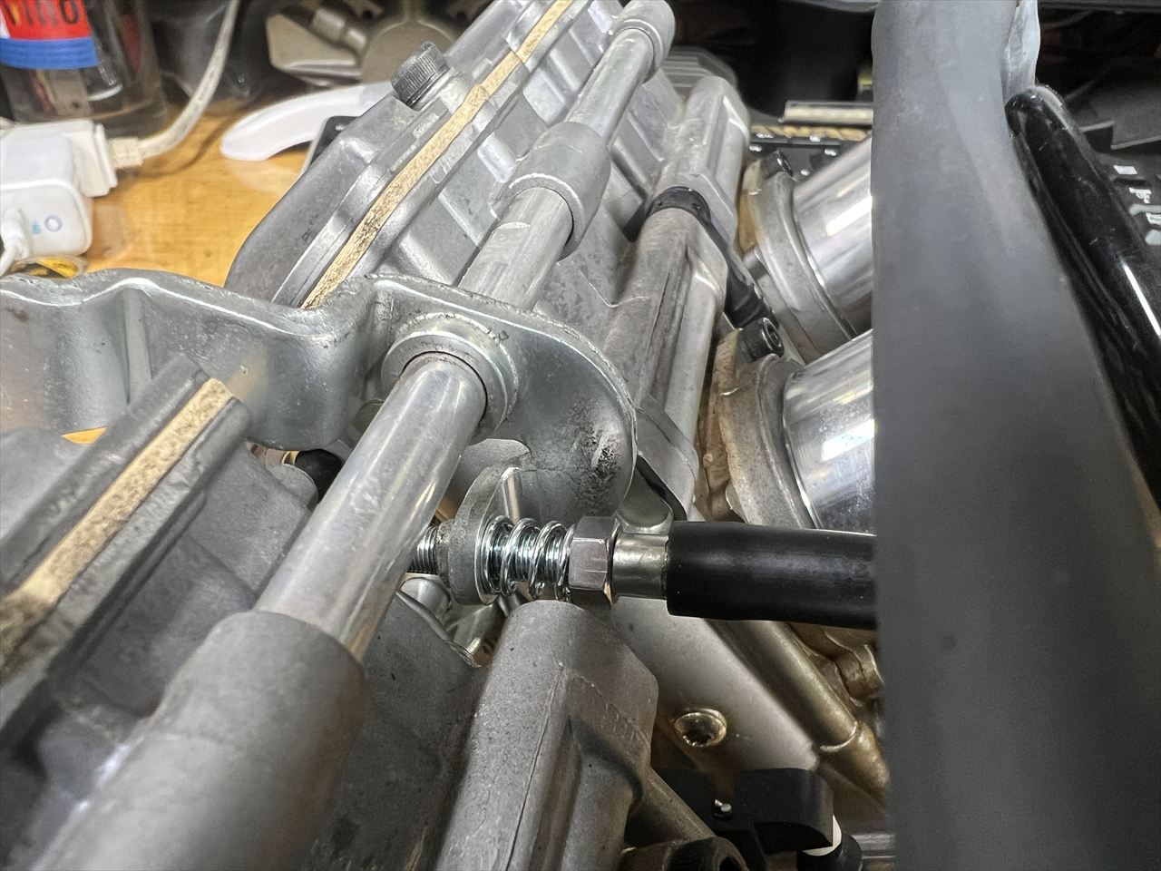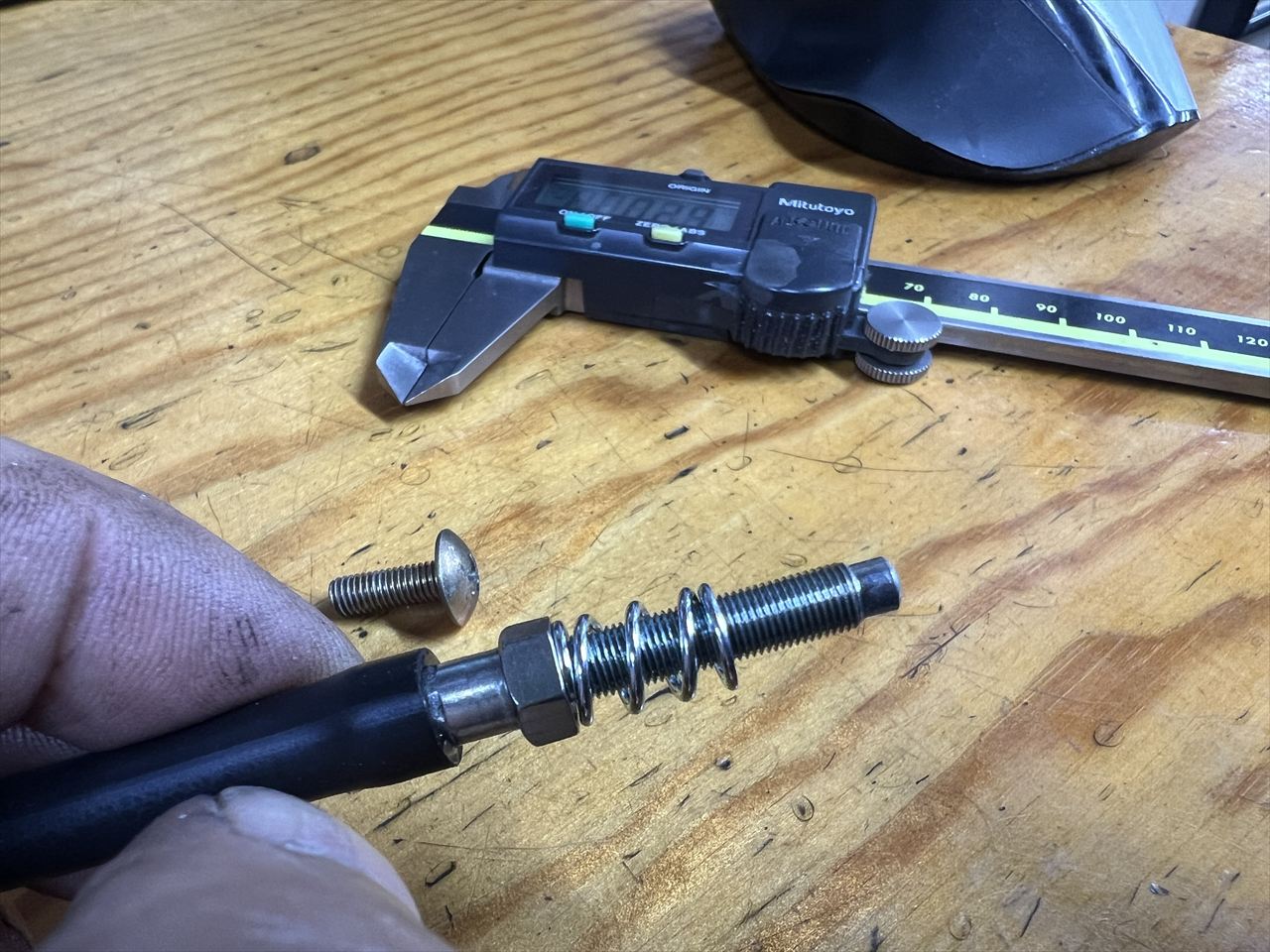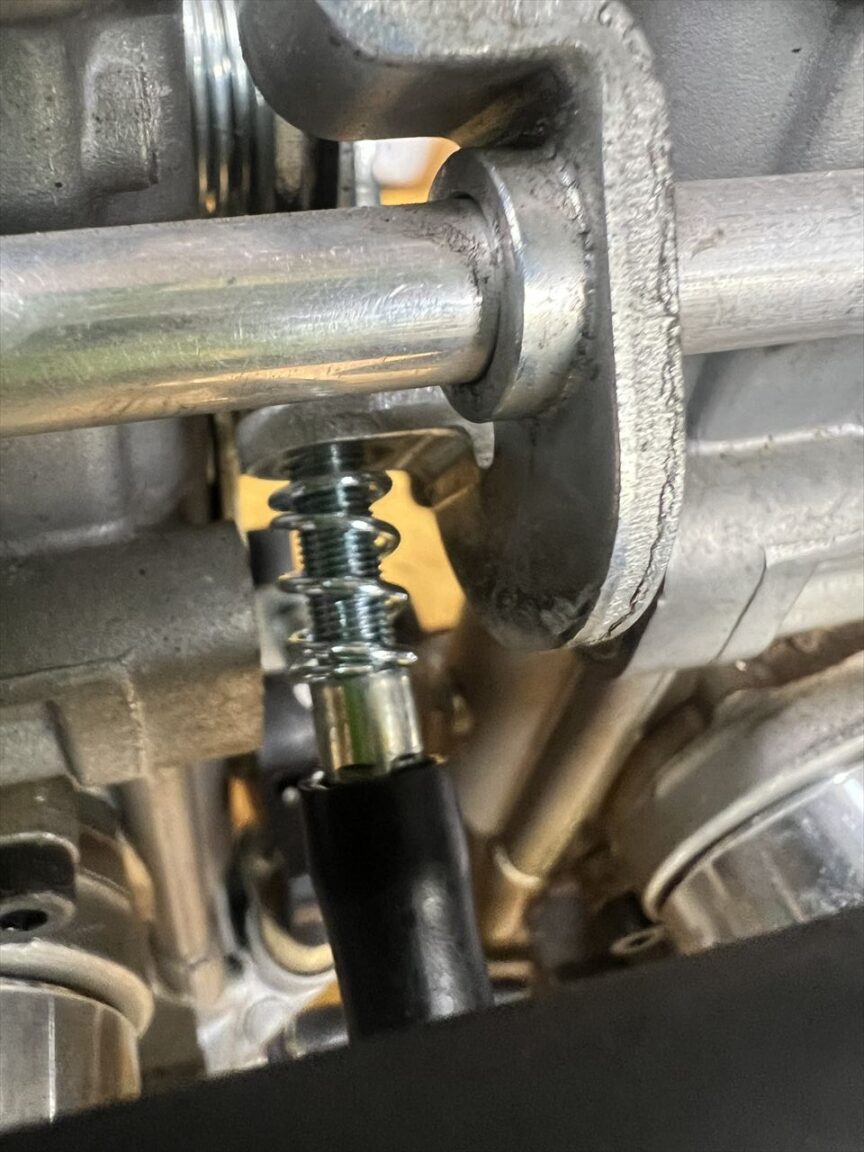 画像のスプリング上側に2ミリほどの遊びがあります。このスプリングは走行中にアジャスターネジが振動で回ってしまわないようにテンションをかけておくためにあります。一定以上縮めた状態で使わないといけません。