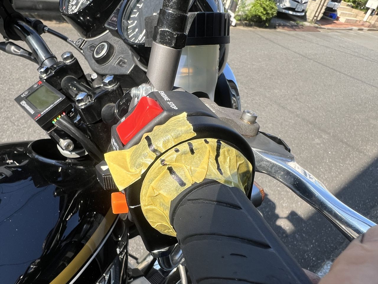 セッティングが決まり、ガレージに戻ります。ちなみにスロットル開度がわかり易いよう、このようにマークを付けてセッティングします。