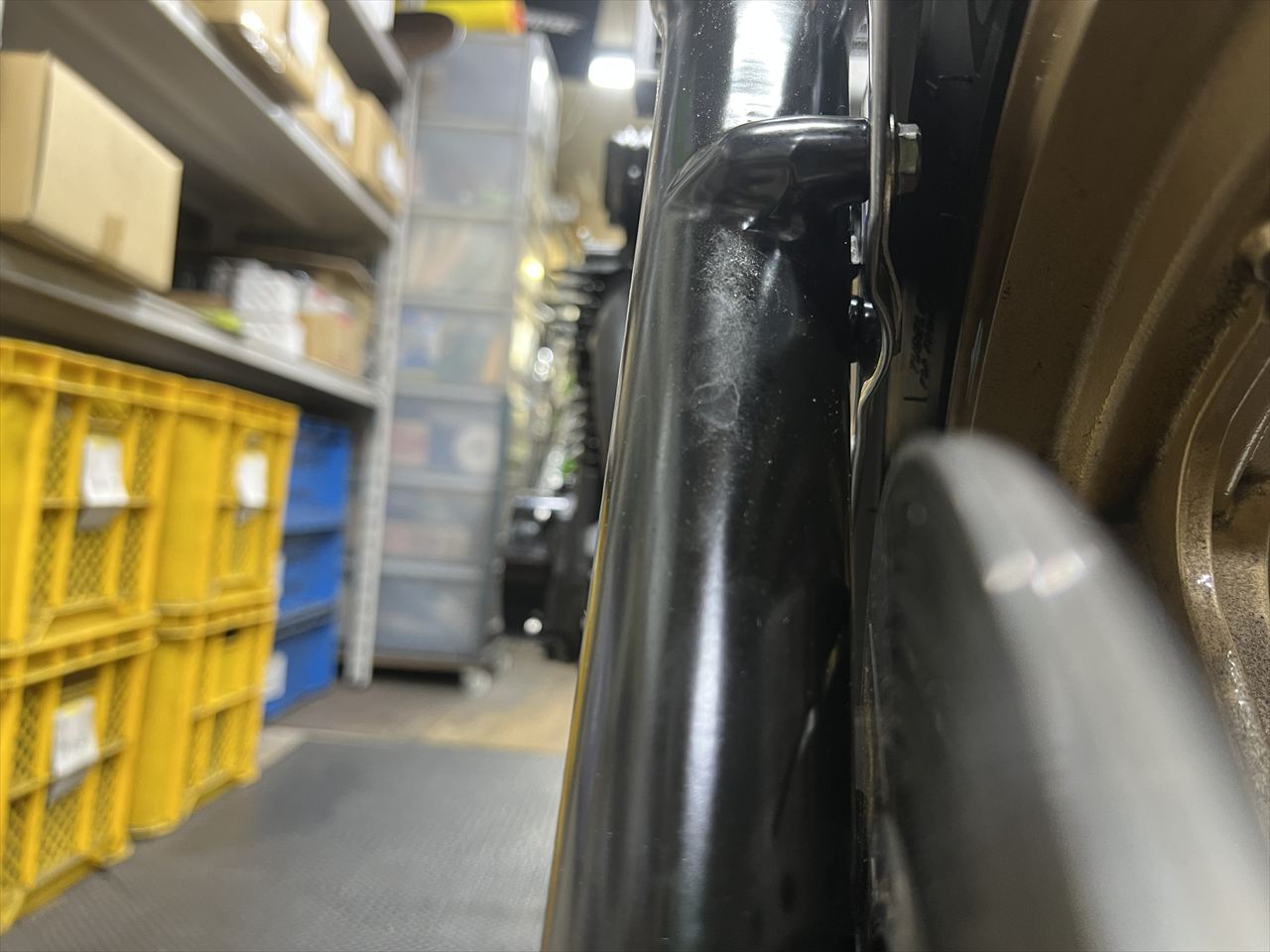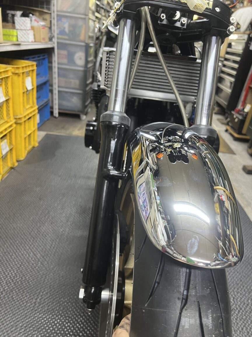 フェンダーとフォークアウターとの位置関係はこんな感じ。干渉しないで取り付け可能です。