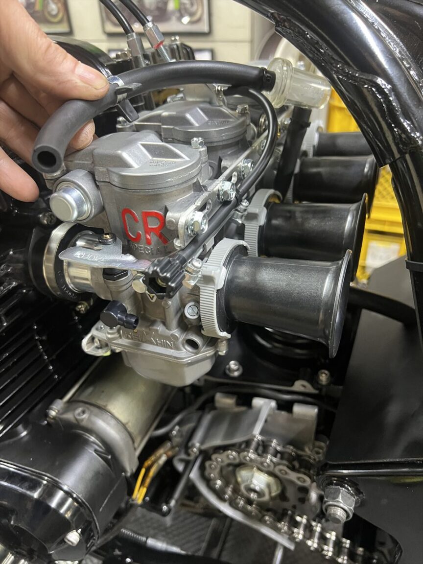 スプロケカバーを取り付け、クラッチレリーズの遊びを調整、チェンジペダルも取り付けます。チェンジリンクはレバー比を大きめに取り、操作力を軽くしています。