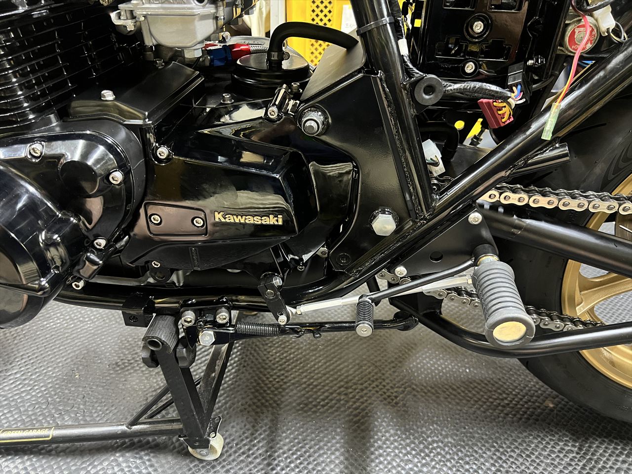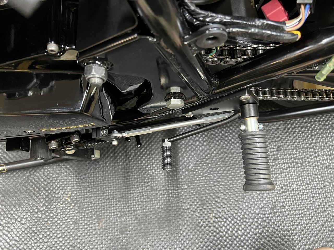 サイドスタンドは脱着式にしていますが、一番のメリットはつま先の邪魔にならなくなることです。その分、バックステップをフレーム側に寄せることが可能で、くるぶしでフレームをホールドし易くなります。これは純正スタンドのままではできないレイアウトです。