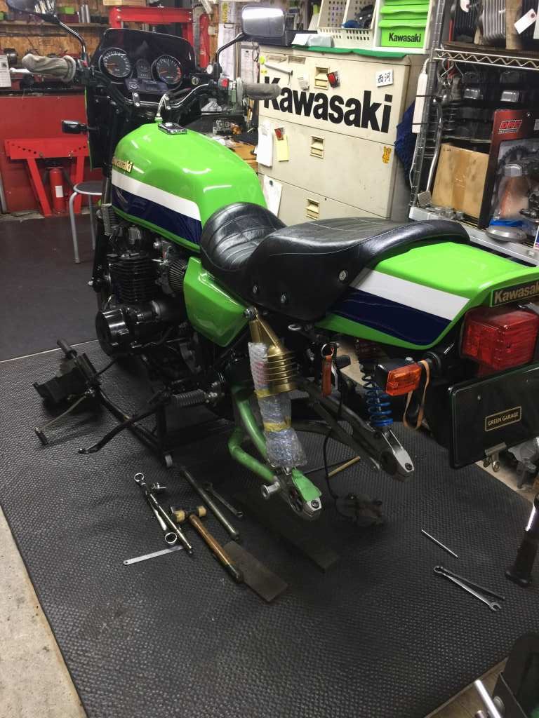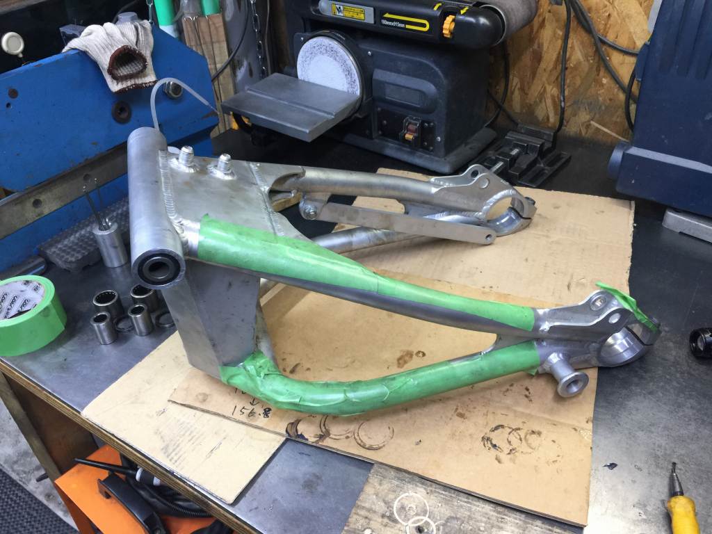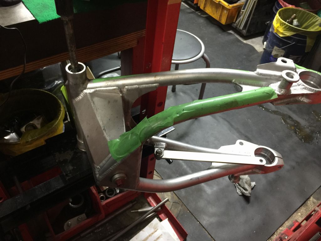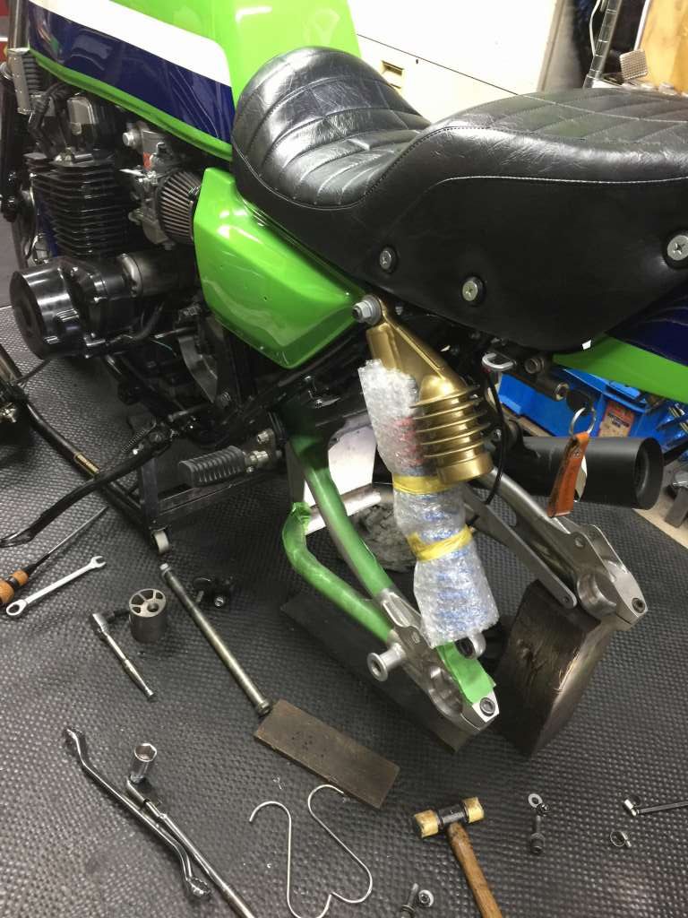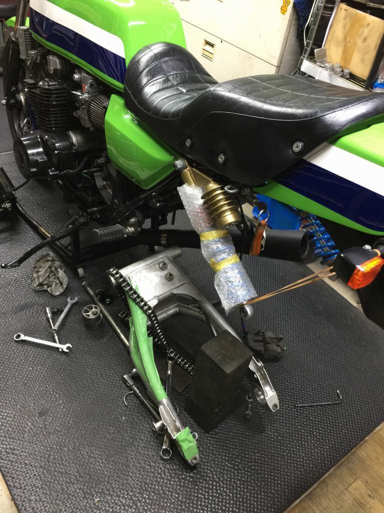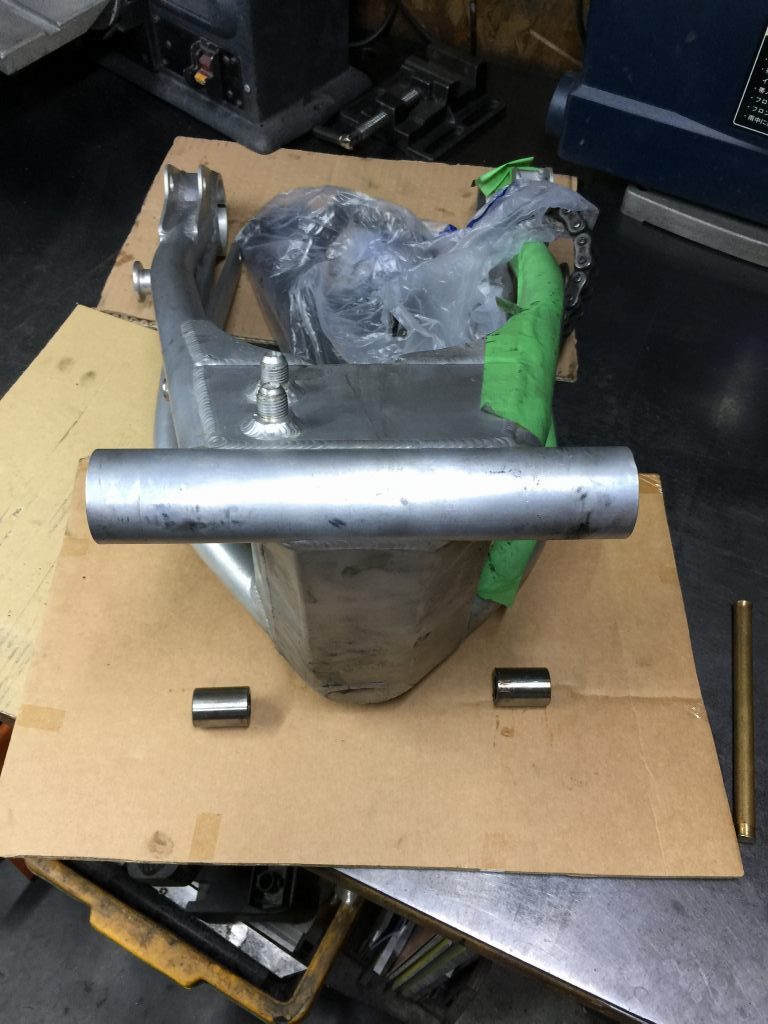 本題のスイングアーム修正に移ります。先ずは取り外し。