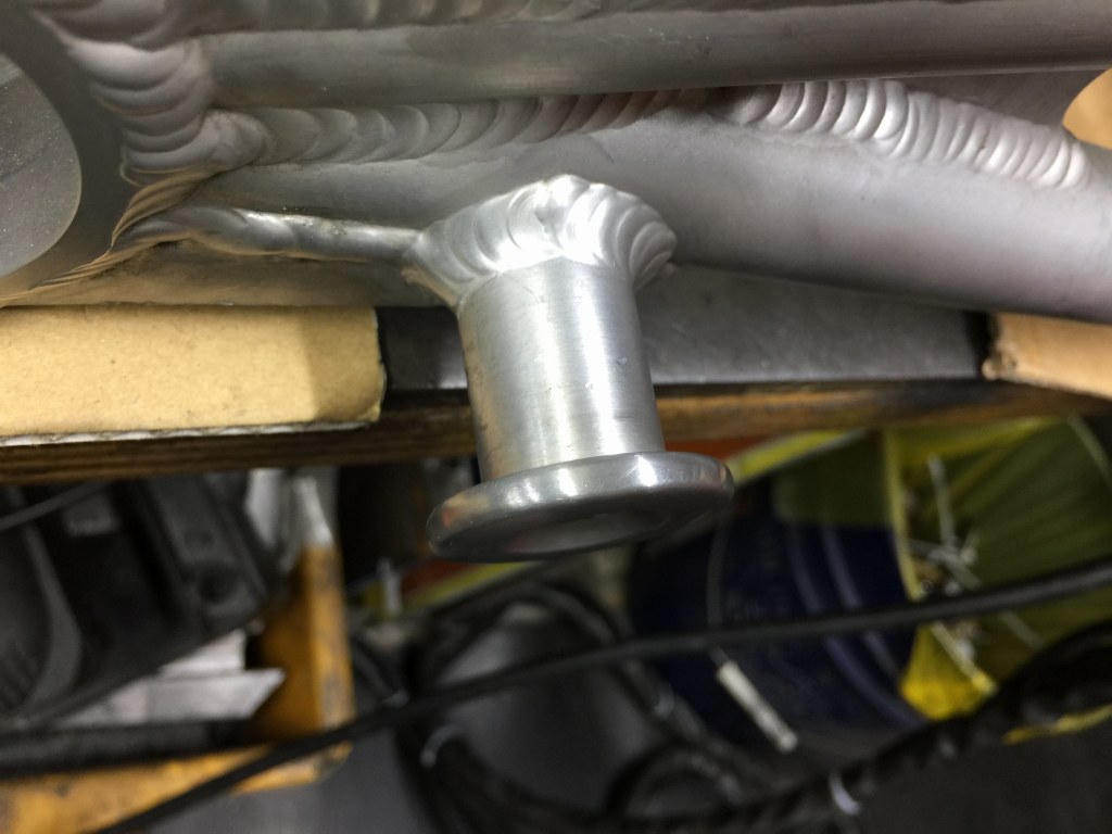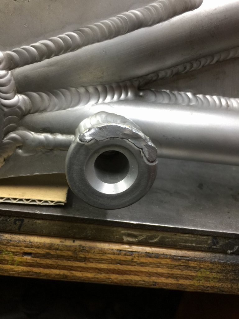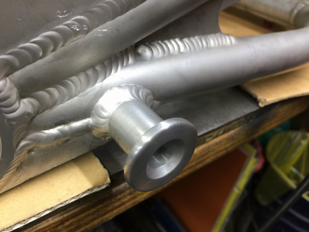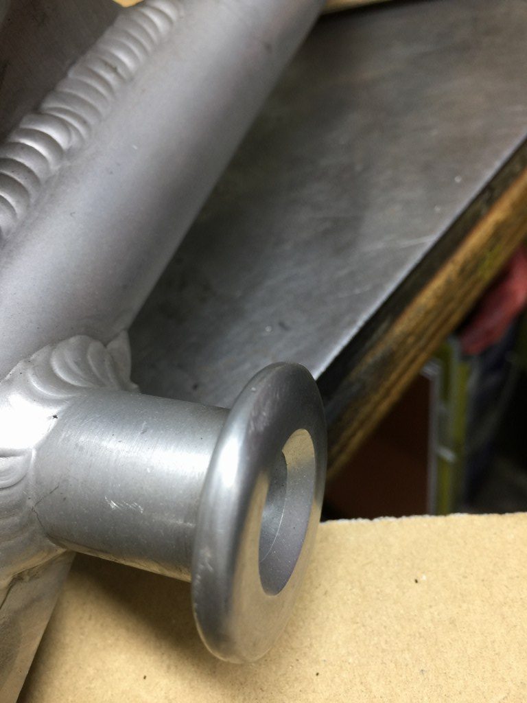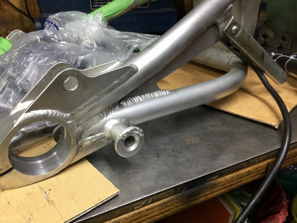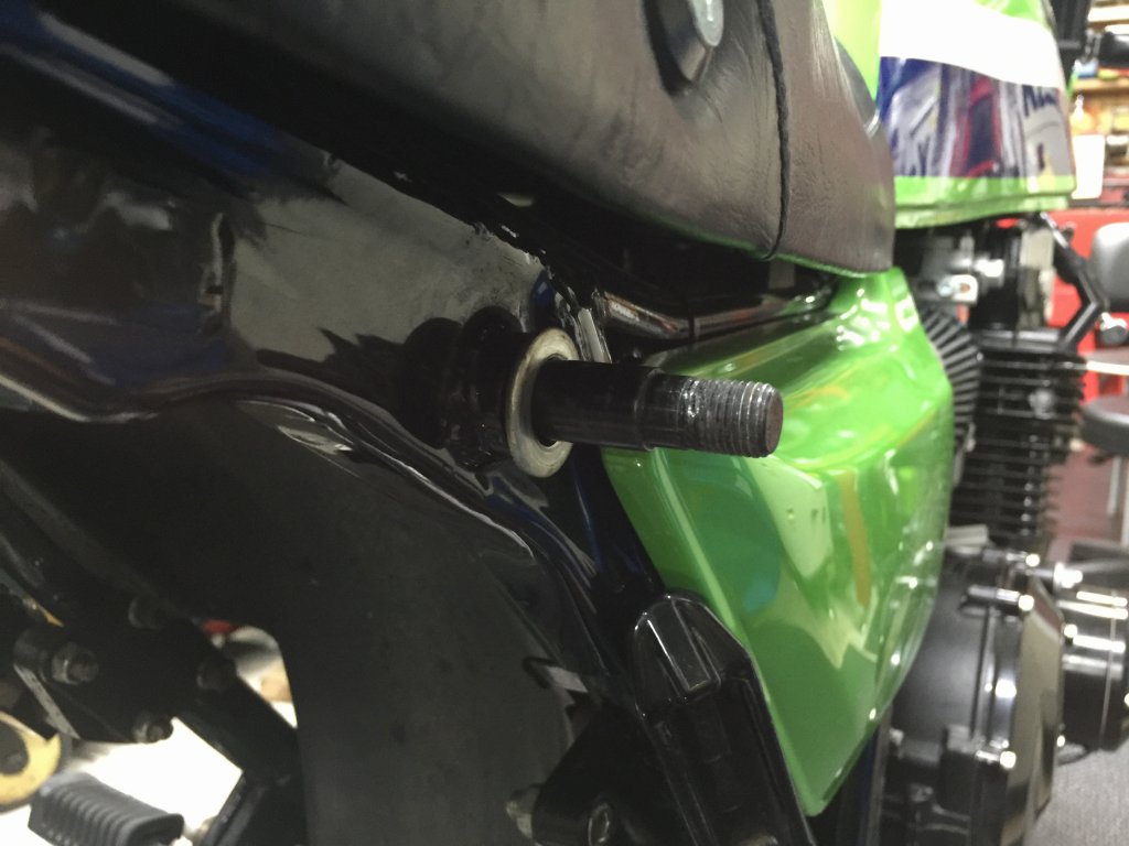 スイングアームの上下動で、右のスタンドフックの縁がマフラーに干渉したそうで、削れた部分を目立たないように滑らかに修正してあるので肉が痩せてしまっています。