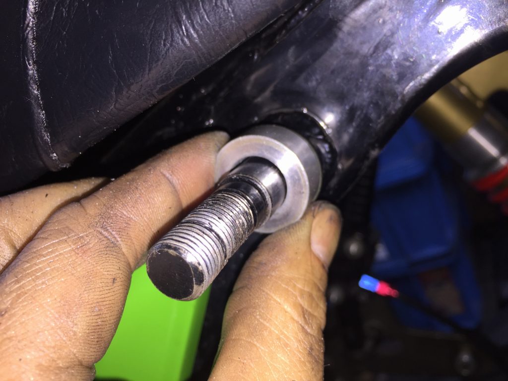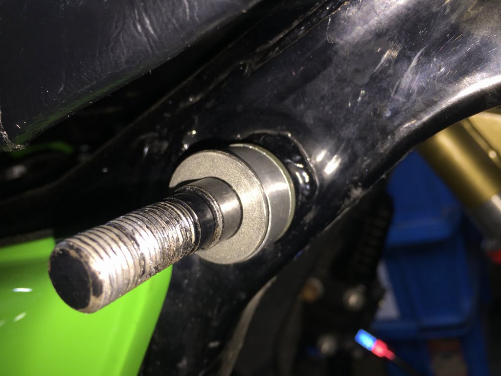 リヤショックのアッパーマウントは、ブッシュのカラーが薄肉なので、マウントピン外径にフィットしたワッシャーに交換します。