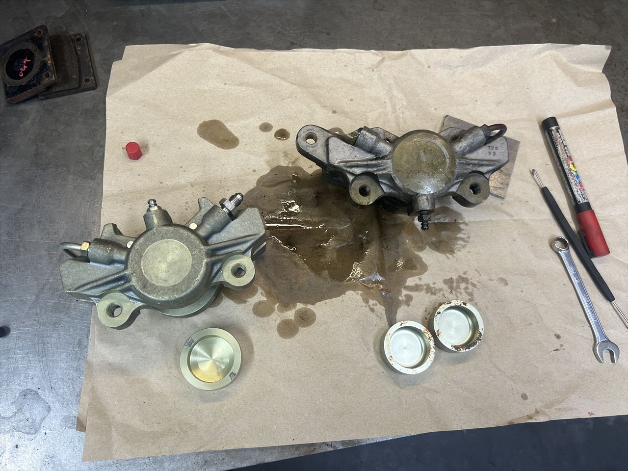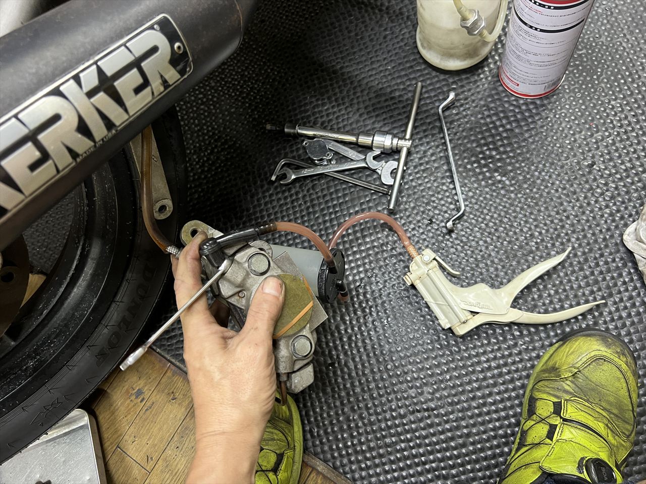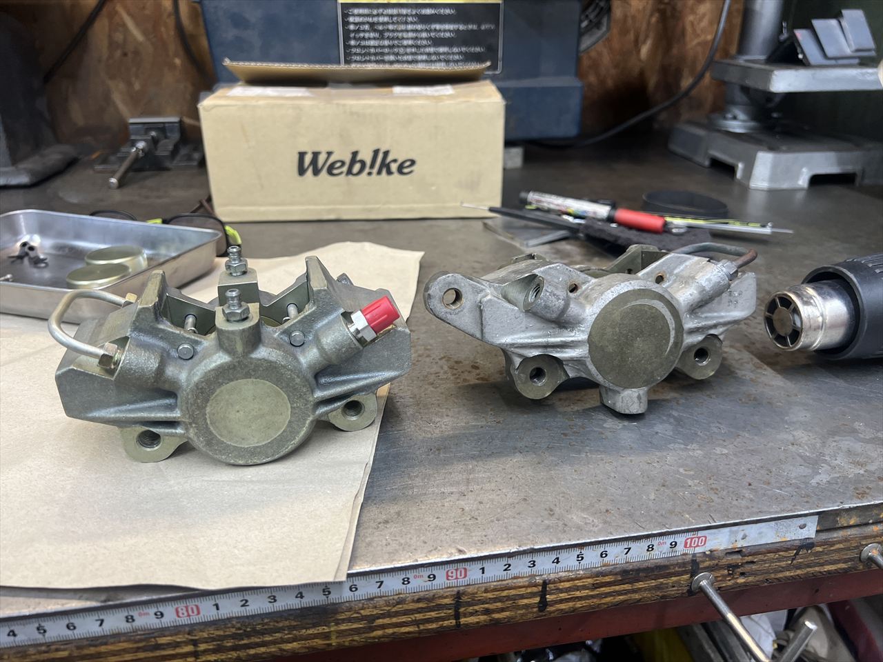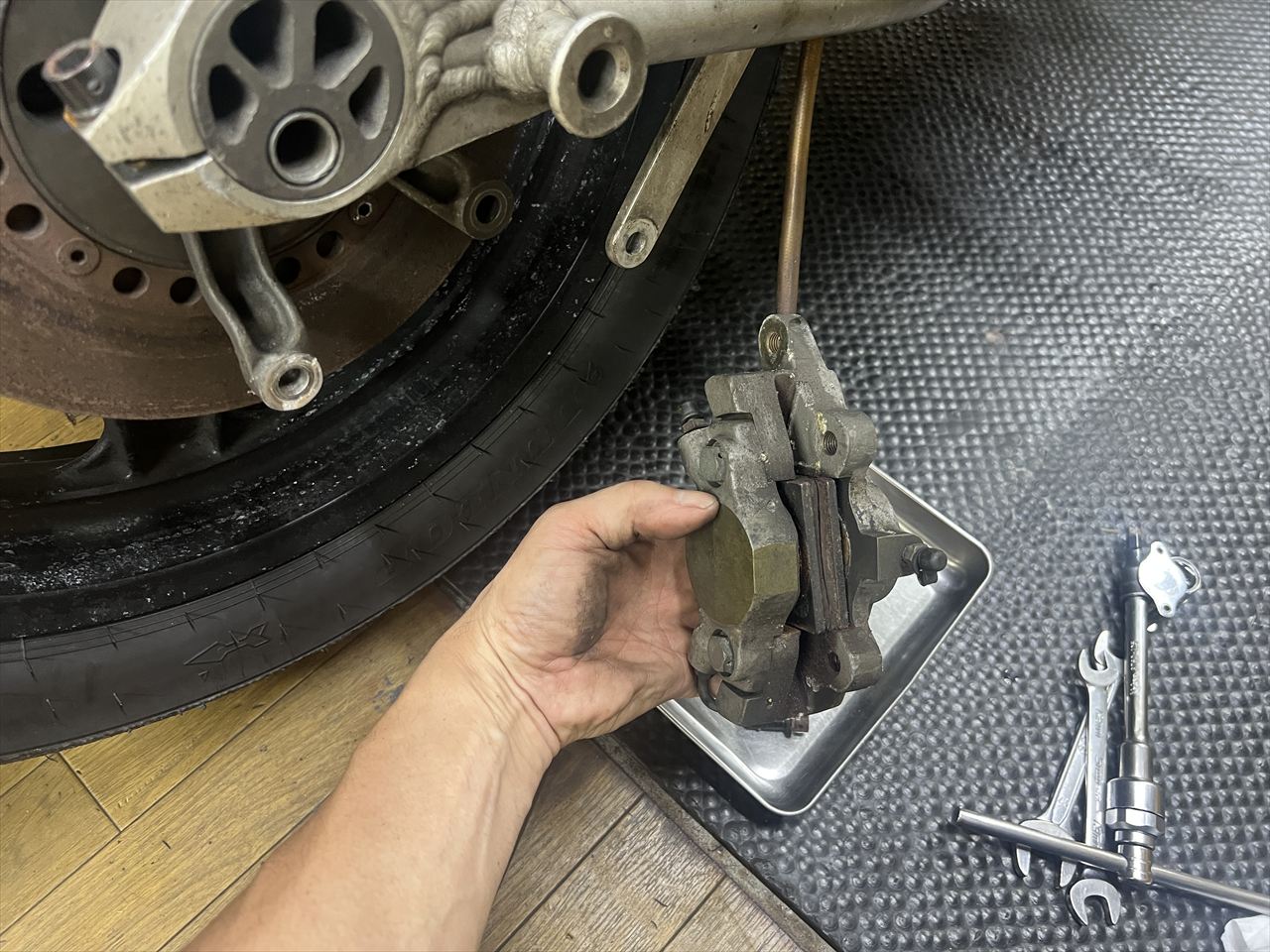 2年前にレストアして公道に戻ったこちらのS1、リヤキャリパーからフルードが漏れてきたとのことで修理します。