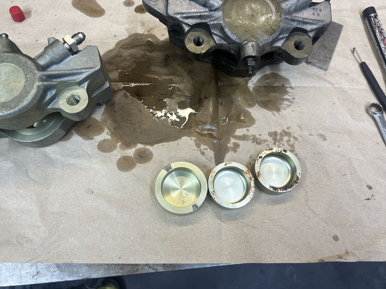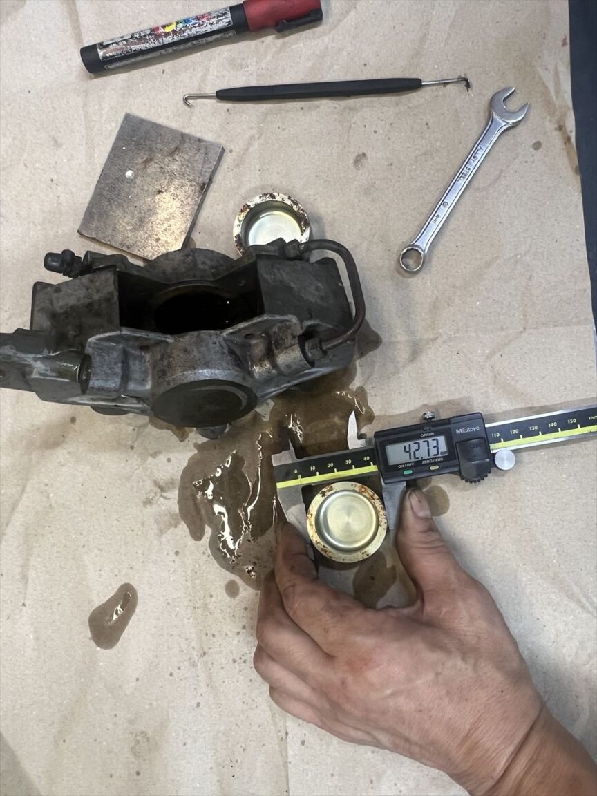 キャリパーのピストンをのぞき込むと、フルードが漏れて濡れていました。
