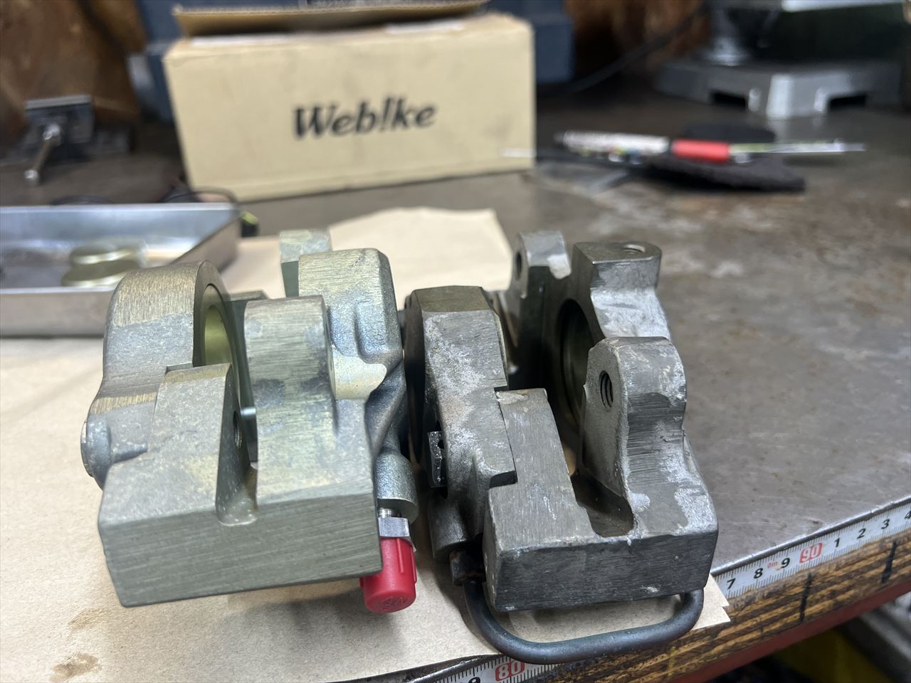 S1リヤキャリパーはあまり見る機会が無いので、フルレプリカのフロントS1キャリパーと比べてみます。外観ではリヤ用はトルクロッド受けがあり、ブリーダーが上下逆に付いています。