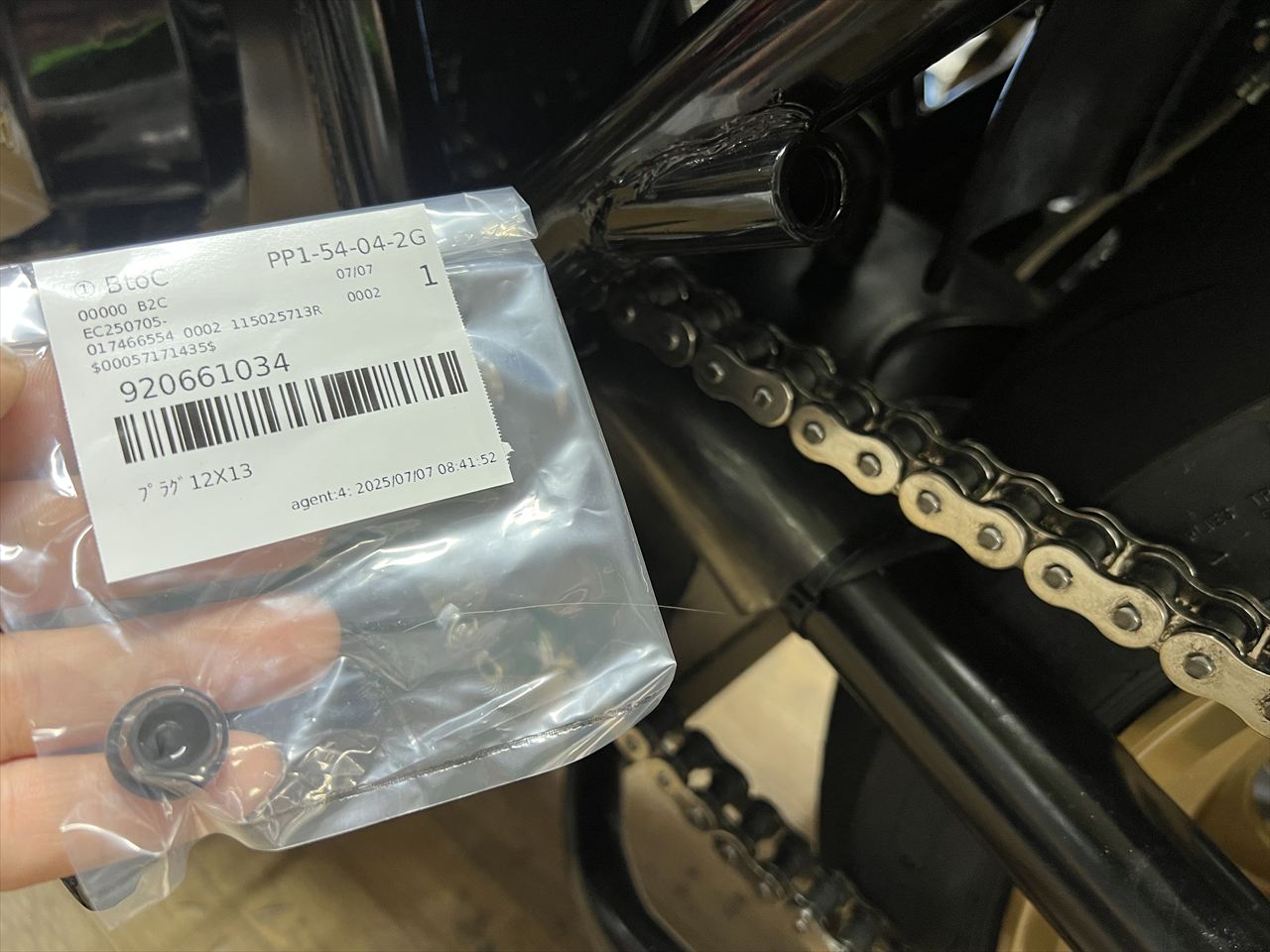 ガレージに戻り納車の準備をします。左ステップの上辺りにあるこのパイプ、純正オプションのロックケーブルが格納される穴です。この車両にはケーブルは無くプラグが付いてましたが、フレーム塗装の際に外していました。改めて純正部品を探すと、まだ販売中と解り即注文。入庫したのがこちらです。