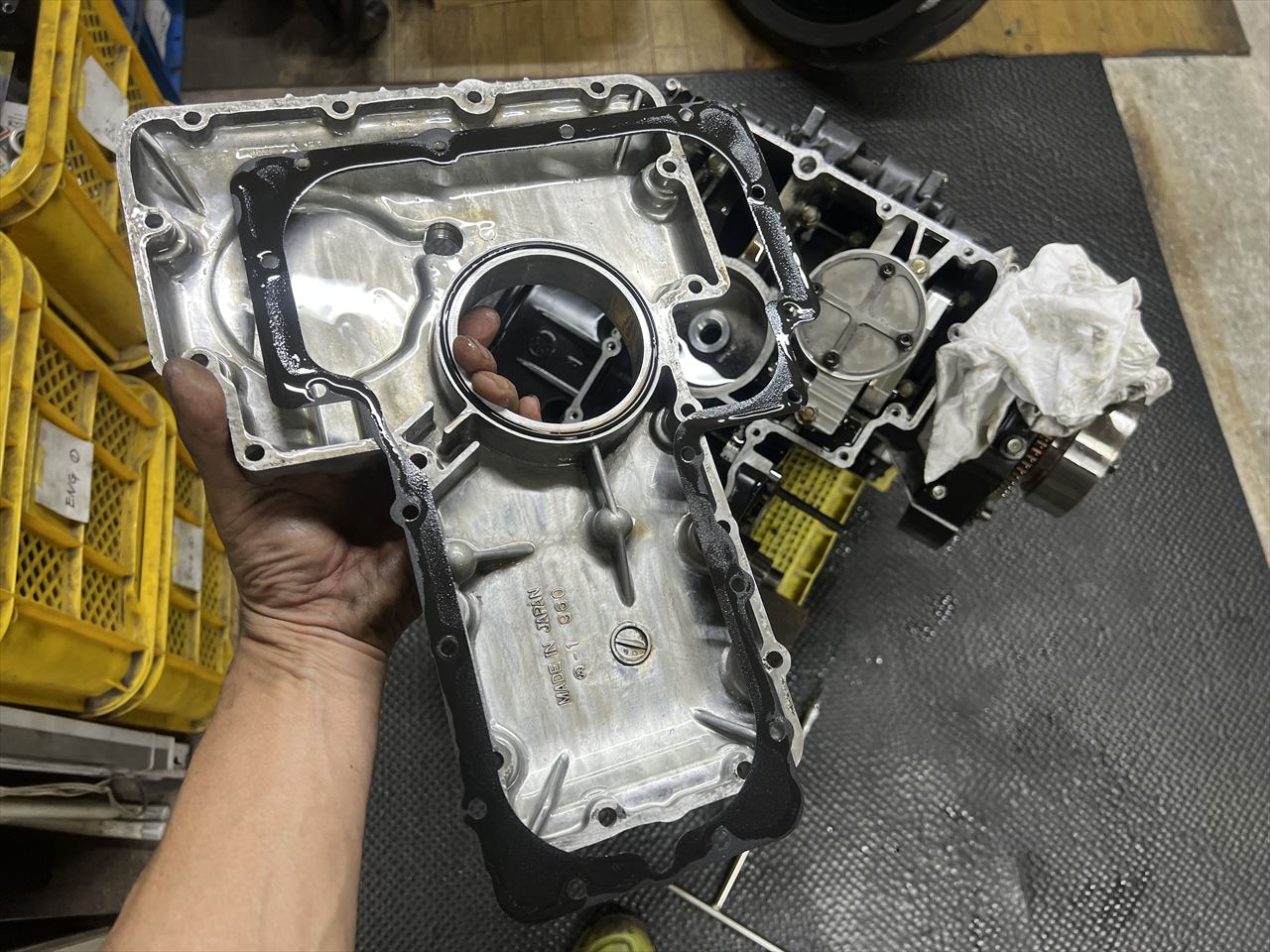ケースを合体し、オイルポンプを取り付けます。オイルパンのガスケットも信頼性のある純正を使います。