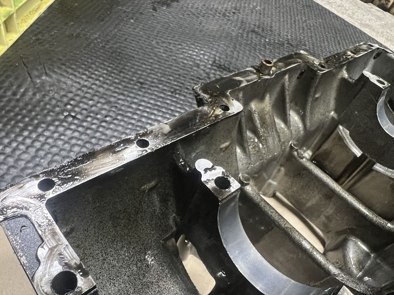 後ろ側も同様に漏れています。オイルパンの合わせも若干滲んでいます。