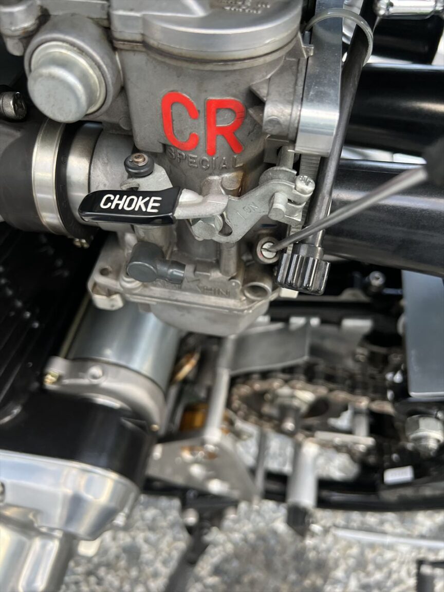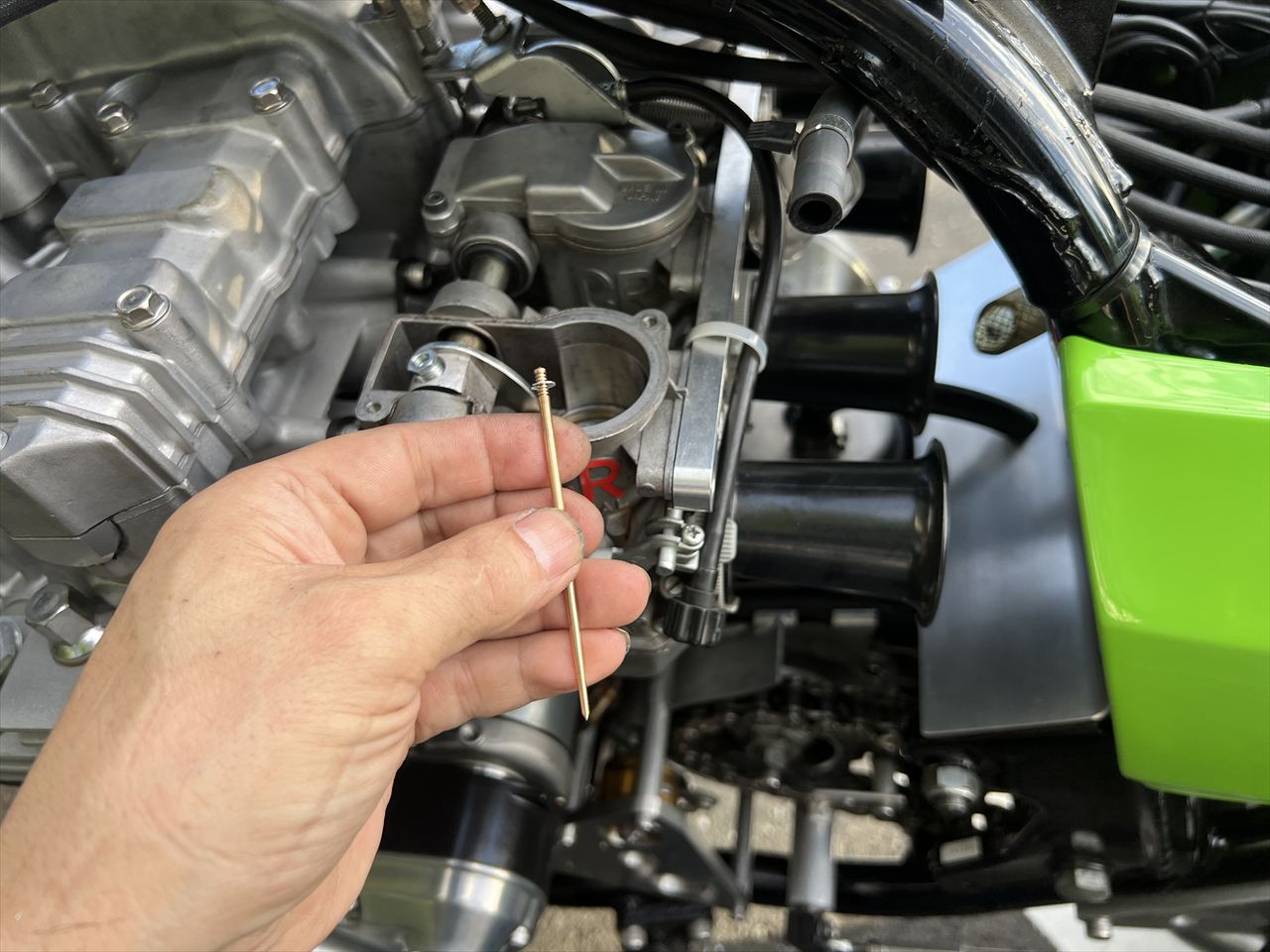 スロットル開度1/4~1/2近辺なので、ニードルのクリップ段でしょう。走行中にチョークを引いてリッチにし、燃料が薄かったことを確認していました。クリップの位置を1段下にします。