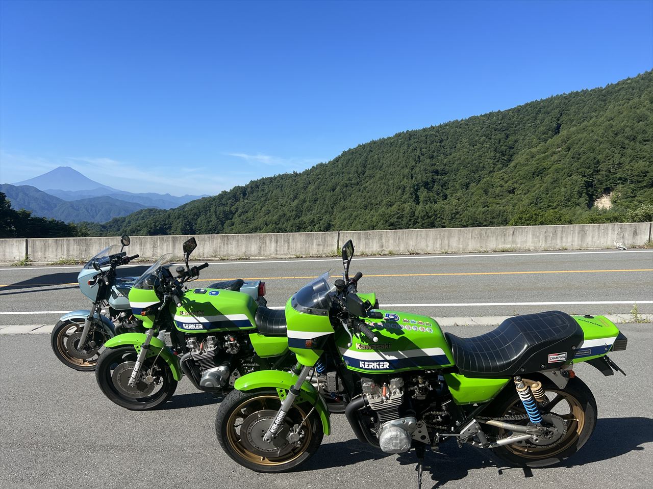 峠から甲府側へ下って直ぐのビューポイントでも記念撮影。このあと精進湖まで足を延ばして帰りました。