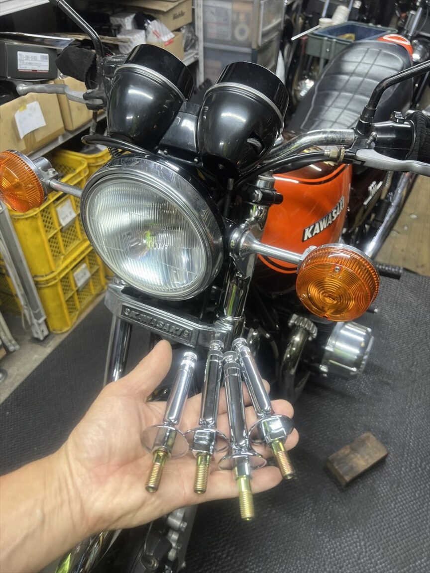 車検後ガレージ戻り残りの作業です。ウインカー本体も交換予定でしたが、PMCもドレミも長期欠品中。納期も不明とのことで今回はステーのみ交換します。