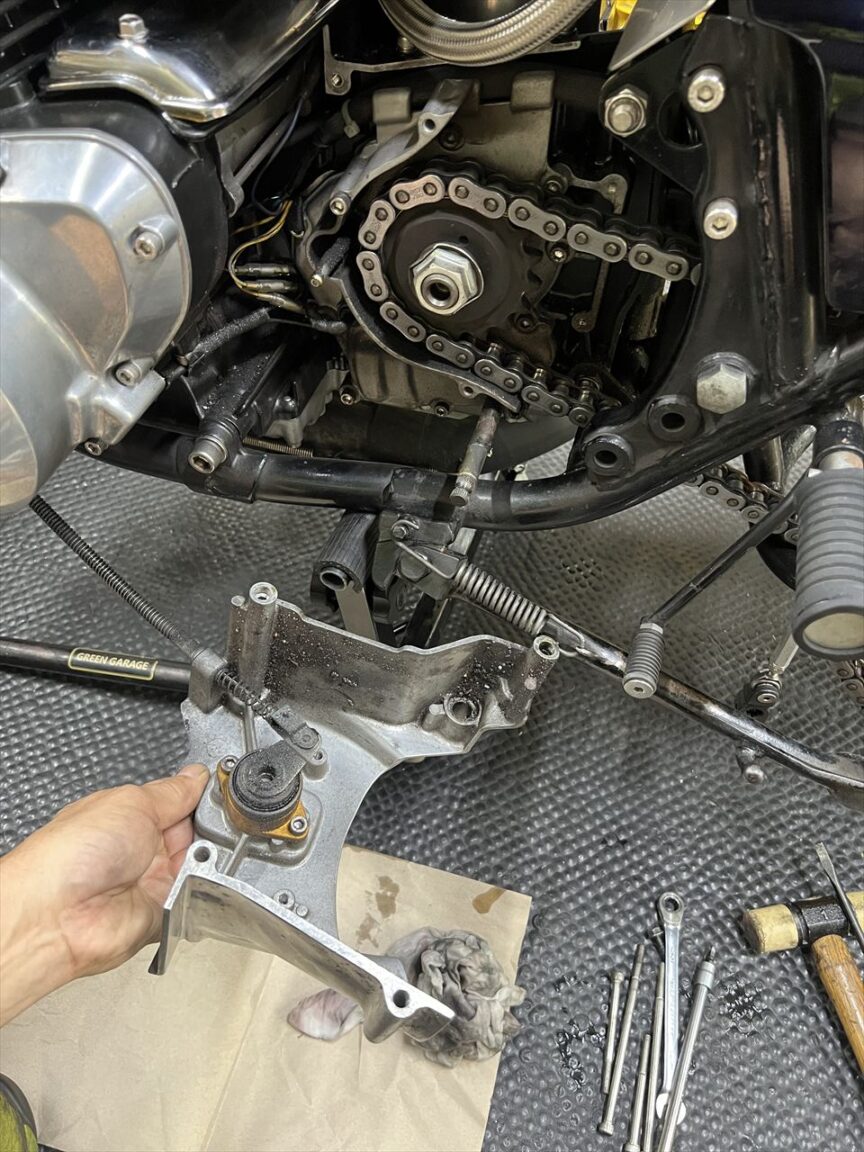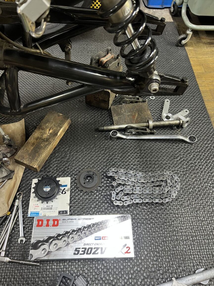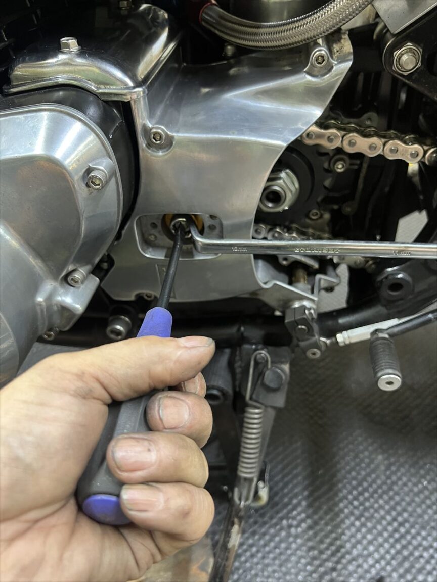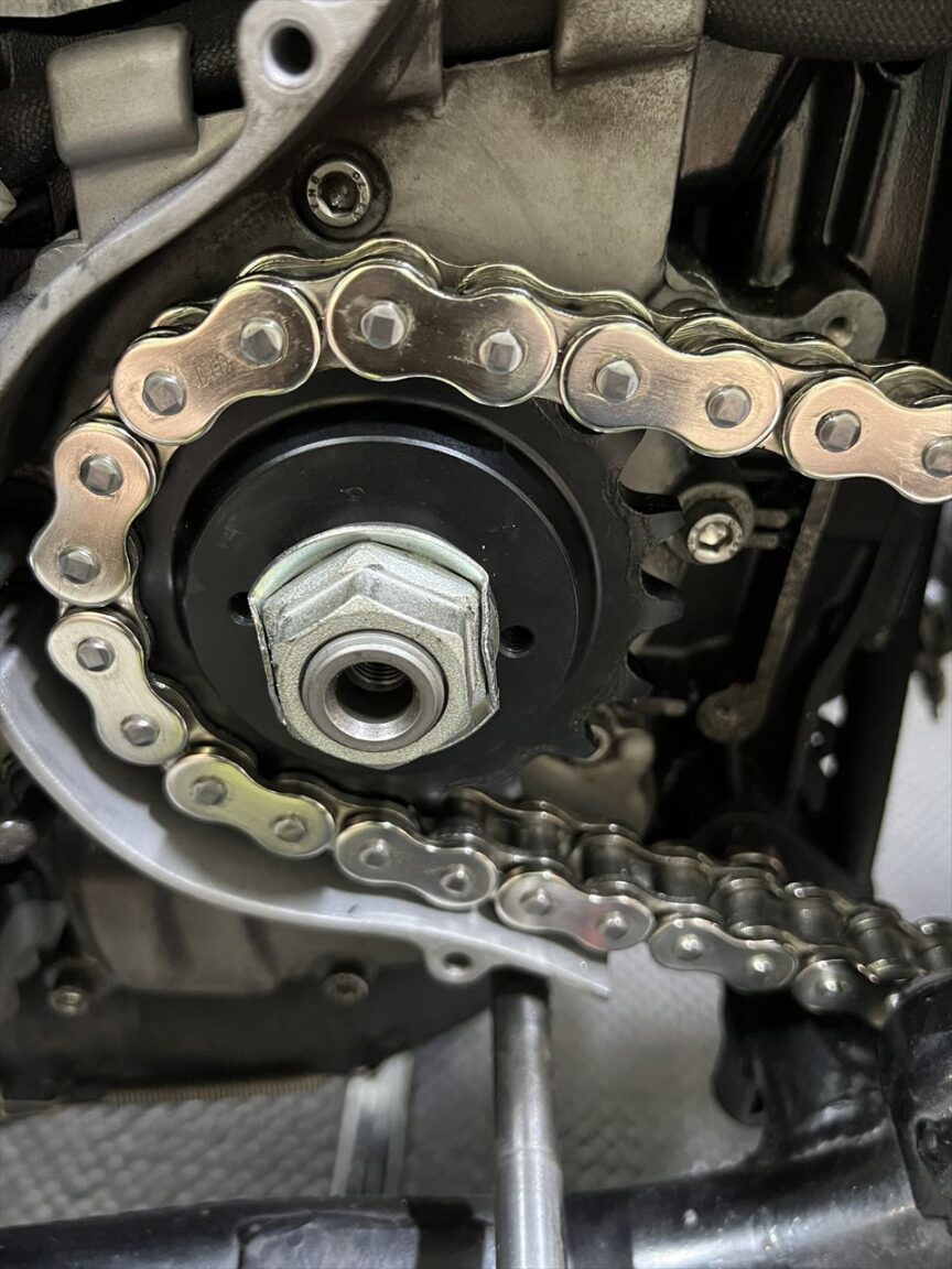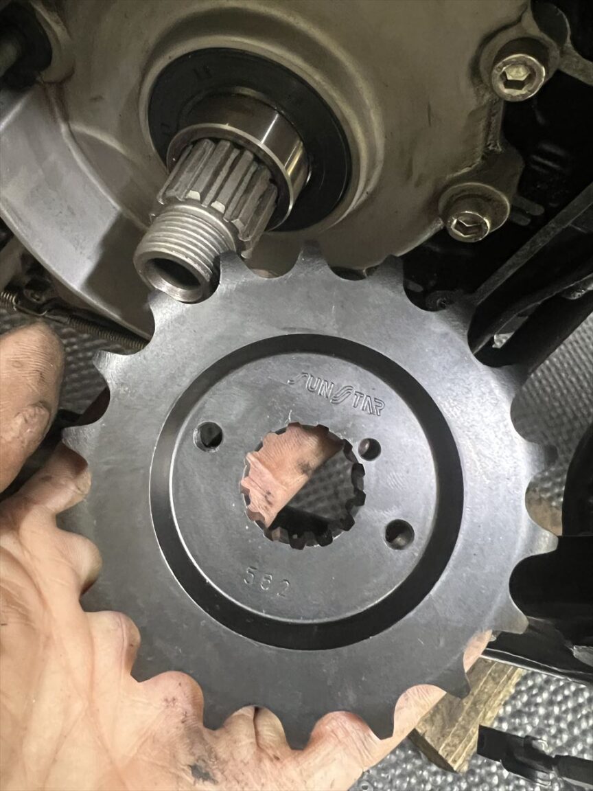 アウトプットシャフトはエンジンオーバーホールの際に社外のシャフトに交換しています。全長が10ミリ長いく、チェーンラインは5ミリオフセットさせているので、5ミリオフセットスプロケを裏返しにして使います。