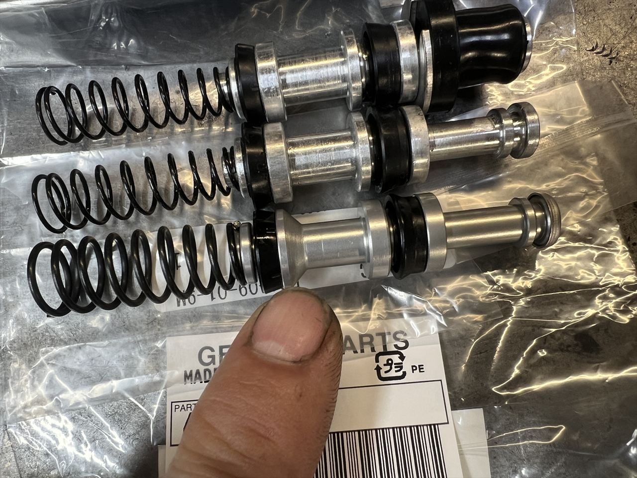 本題のフロントマスターのピストンです。上・社外新品、中・社外の中古(今回外した不具合品)、 下・純正新品 です。シリンダー内径が同じで、全長もほぼ同じ。細部は異なるところもありますが、どうやら互換性はありそうです。