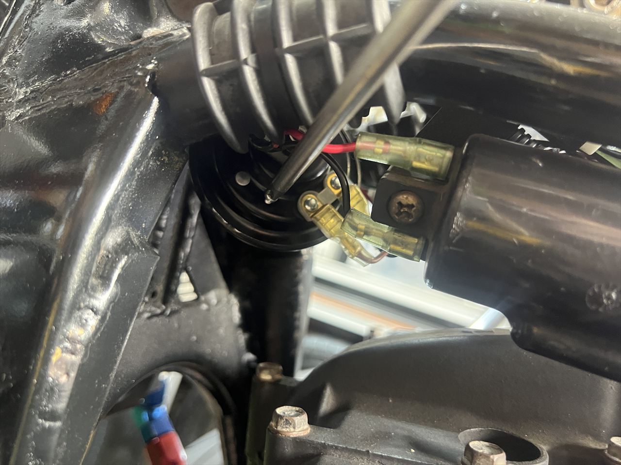 ホーンはイグニッションコイルの前方に1個だけ。調整ネジを1/4回転ほどゆるめてやったら復活しました。