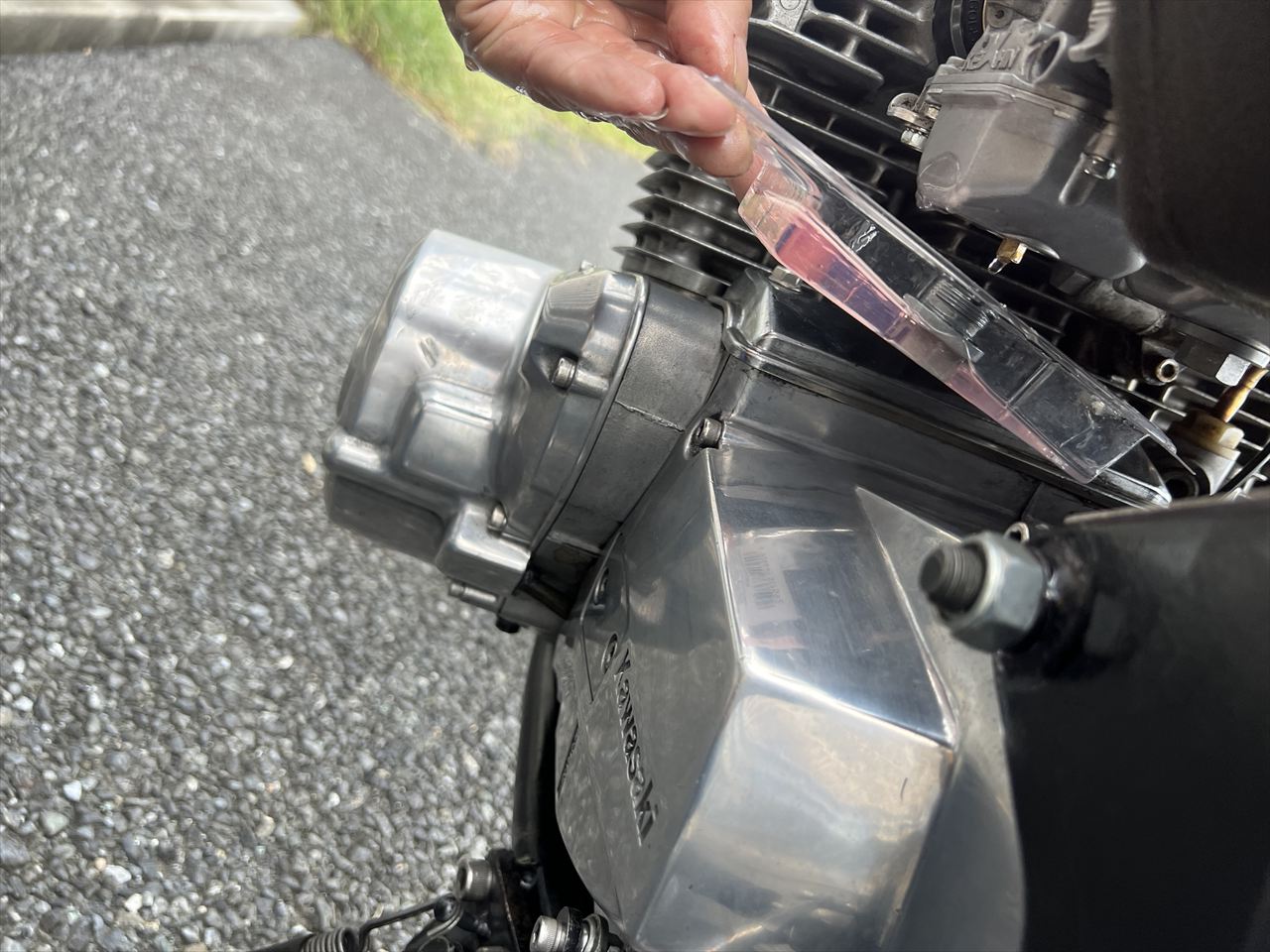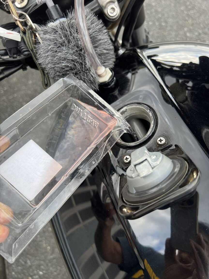 出先ではガソリンを捨てられないので、トレーからタンクに戻します。
