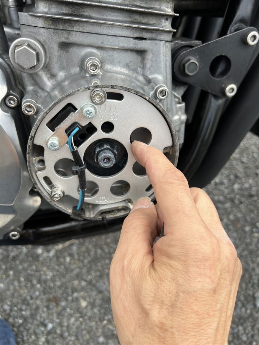 これ以上ダイヤルでは遅角できないので、ピックアップコイルのベースプレートを回してもう5°遅角させます。イニシャル設定が10°なのに対し、この写真の状態は5°です。この数値は圧縮上死点前何度という意味で、クランクの回転方向にプレートを回すと、点火時期が遅くなるということです。