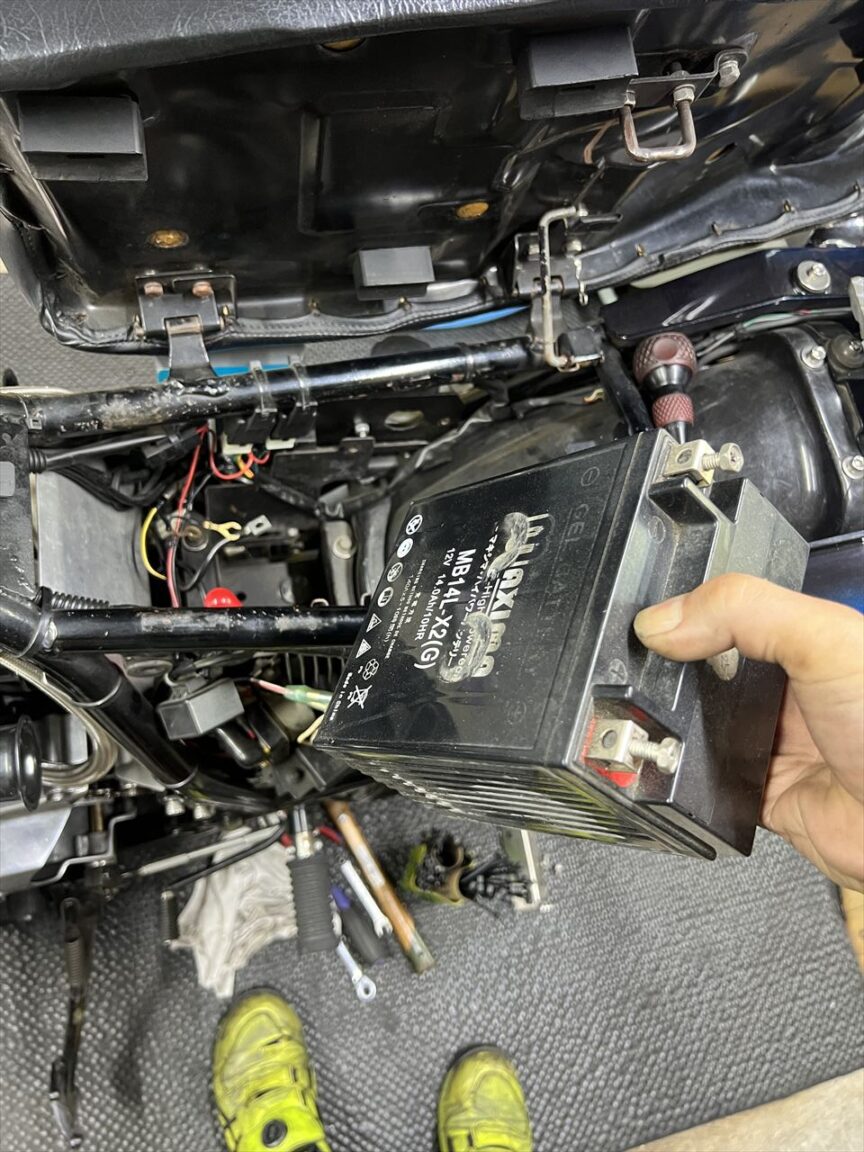 走行中の電圧もあまり上がらなかったのでバッテリーも交換します。貼ってあったメモには21年とあり、4年ほど使用していたようです。