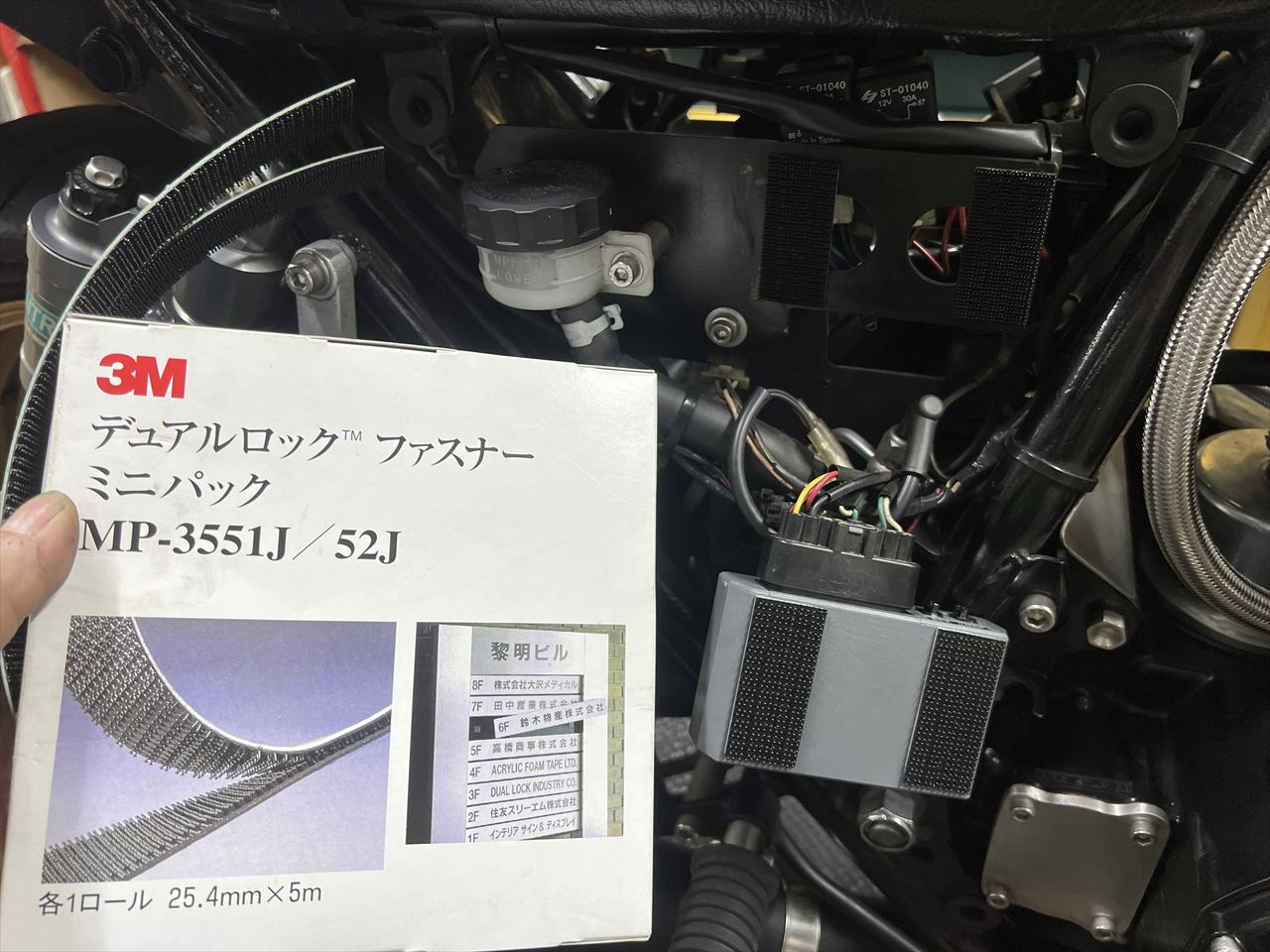 取り付けには、脱着できると整備性がいいので、頑丈に保持できる3M製のデュアルロックファスナーを使います。