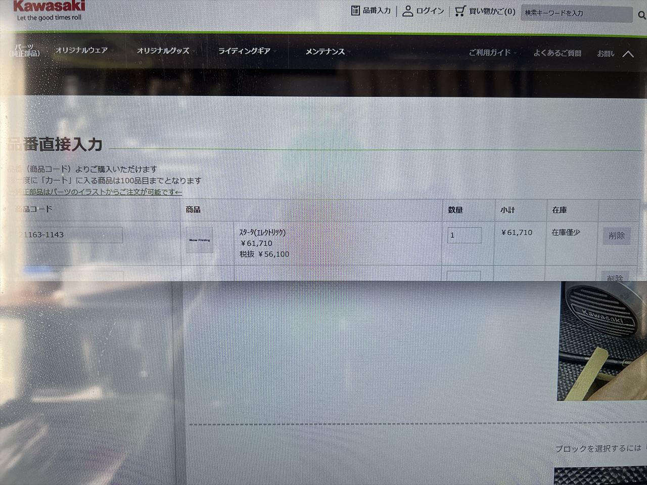 暖気後、スターターの回転不足で始動性の悪かったので、スターターモーターの劣化を疑い現行新品の純正品に交換します。カワサキの在庫表示は「在庫僅少」となっているのでもうすぐ廃盤になるようです。未交換の方は無くなる前にキープしておくことをお勧めします。
