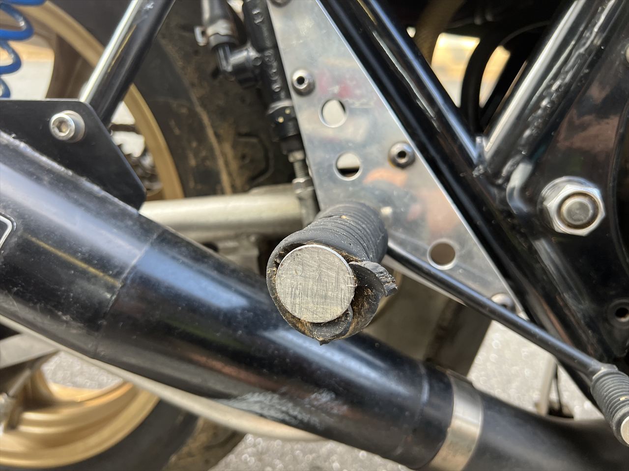 右のステップ。曲がりはないものの、ゴムがめくれて破れているのでペグを交換します。